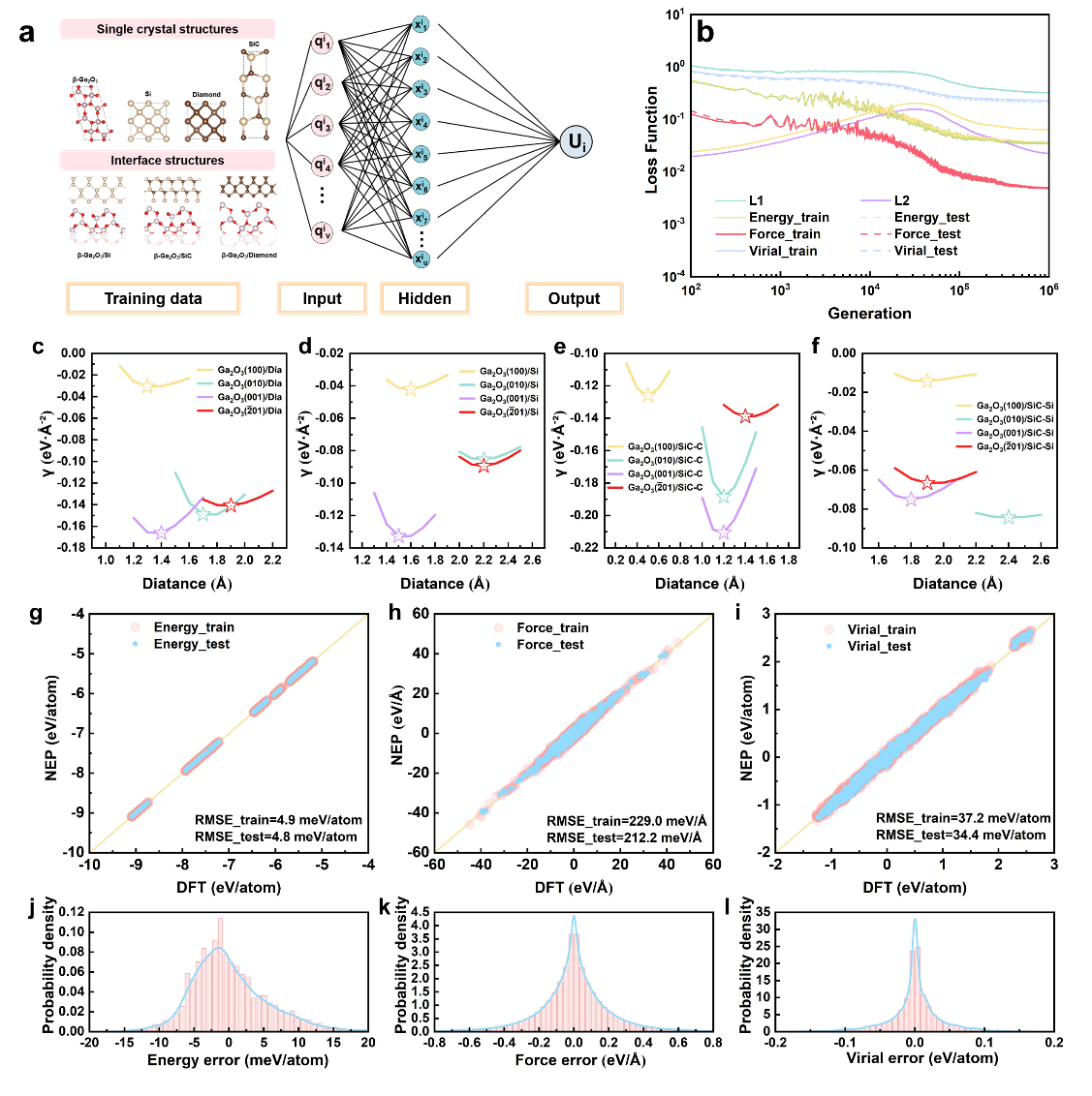 Fig.2 Schematic illustration of the NEP framework and machine learning performance. a Composition of the training dataset and schematic of the NEP model architecture. b Evolution of the loss function during the training iterations. c-f Interfacial energy as a function of interfacial distance for different interface structures. g-i Comparison between NEP-predicted and DFT-calculated energies, forces, and virial stresses. j-l Probability density distributions of the prediction errors for energy, forces, and virial stresses.