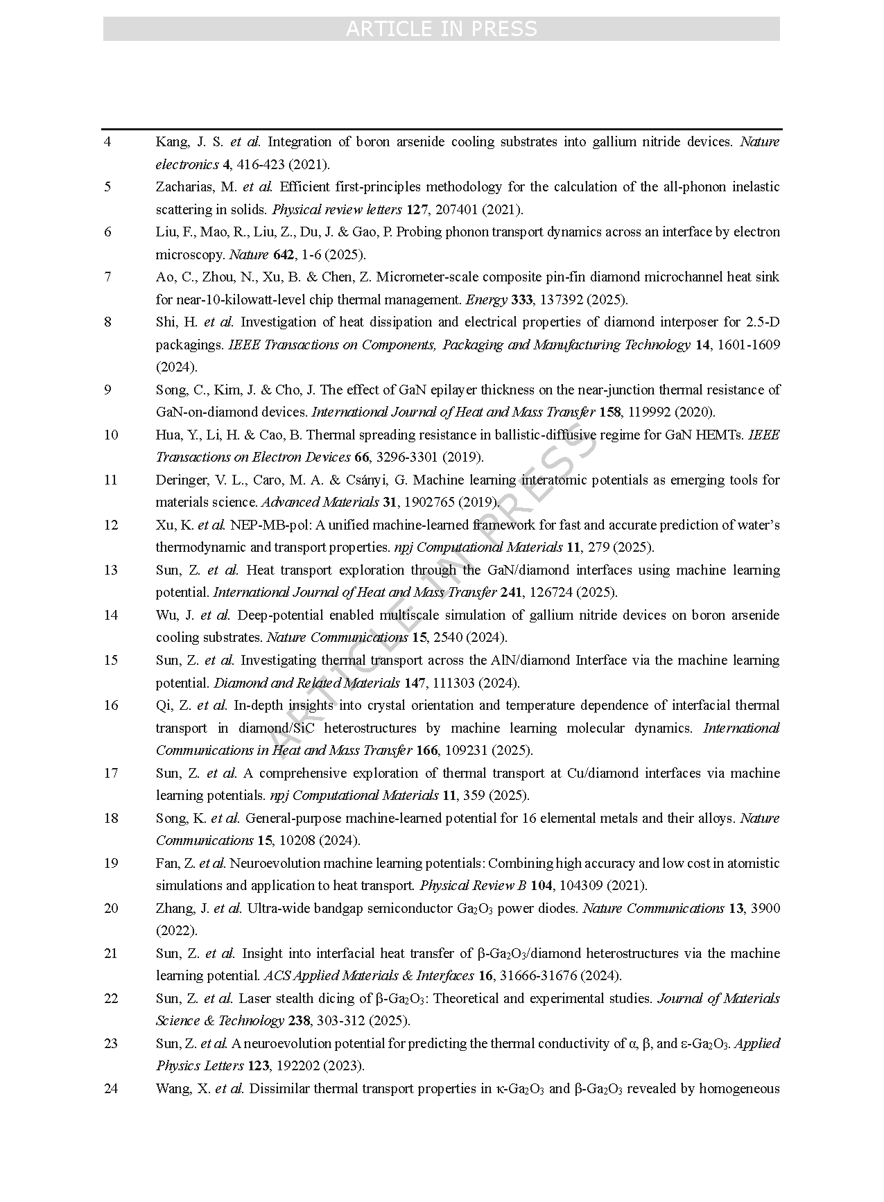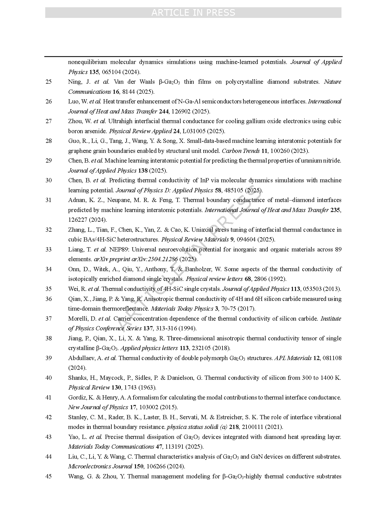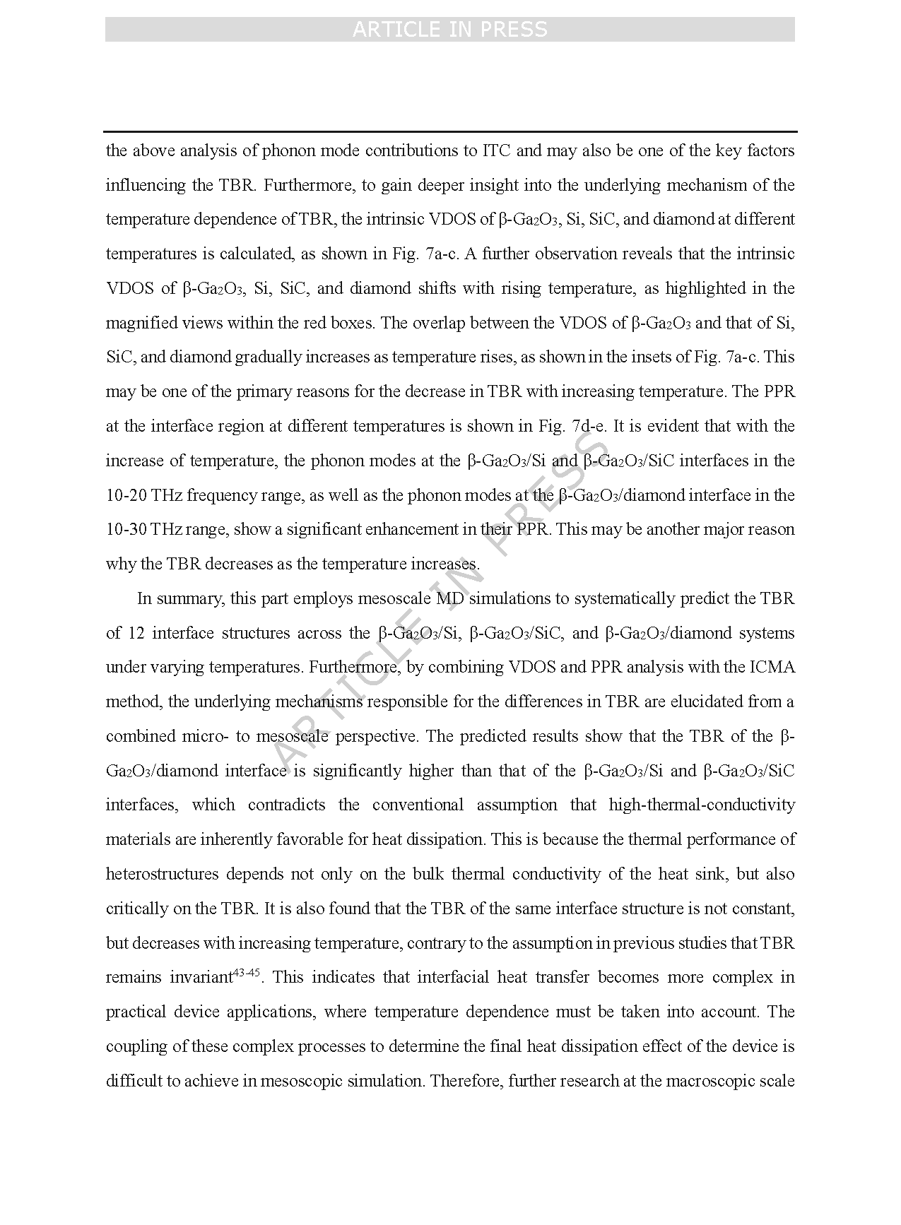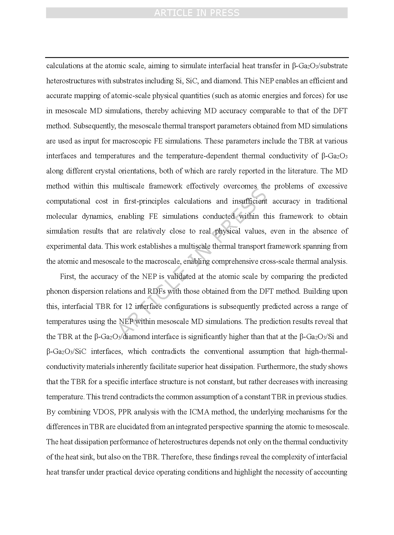 Gallium oxide (Ga2O3) is an ultrawide-bandgap semiconductor that exhibits significant potential for high-power electronic devices due to its large bandgap, high Baliga’s figure of merit, and exceptionally high critical breakdown electric field. However, the room-temperature average thermal conductivity of Ga2O3 is only around 15 W·m-1·K-1, which significantly limits its applicability in high-power electronic devices. A promising approach to enhance heat dissipation is to construct a heterostructure by integrating Ga2O3 with a high thermal conductivity material serving as a heat-dissipating substrate. However, the thermal performance of heterostructures depends not only on the thermal conductivity of the heat sink but also critically on the TBR. Consequently, single-scale studies are insufficient to fully capture the thermal management mechanisms in Ga2O3-based devices. This underscores the necessity of a comprehensive multiscale study of thermal transport in Ga2O3-based heterostructures.