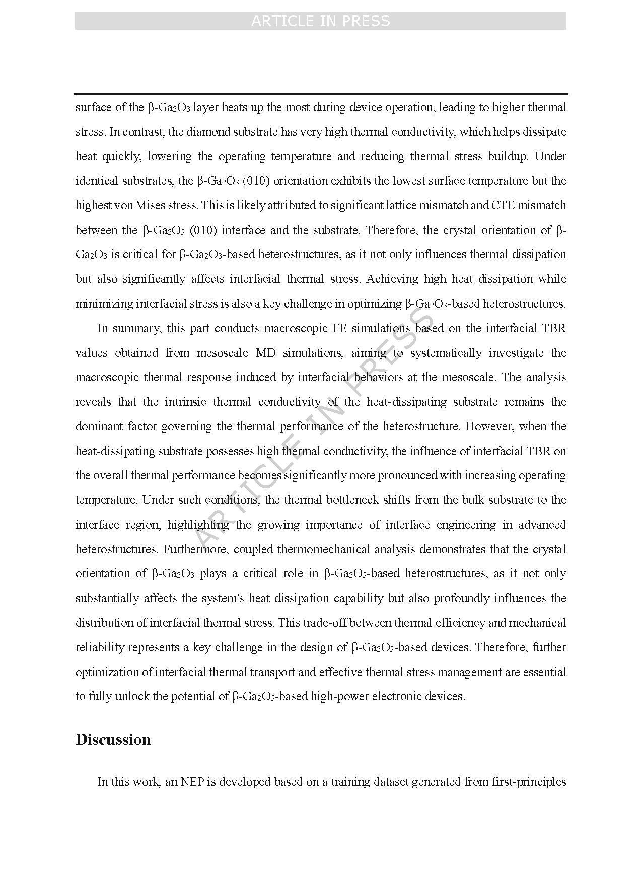 First, the accuracy of the NEP is validated at the atomic scale by comparing the predicted phonon dispersion relations and RDFs with those obtained from the DFT method. Building upon this, interfacial TBR for 12 interface configurations is subsequently predicted across a range of temperatures using the NEP within mesoscale MD simulations. The prediction results reveal that the TBR at the β-Ga2O3/diamond interface is significantly higher than that at the β-Ga2O3/Si and β-Ga2O3/SiC interfaces, which contradicts the conventional assumption that high-thermal-conductivity materials inherently facilitate superior heat dissipation. Furthermore, the study shows that the TBR for a specific interface structure is not constant, but rather decreases with increasing temperature. This trend contradicts the common assumption of a constant TBR in previous studies. By combining VDOS, PPR analysis with the ICMA method, the underlying mechanisms for the differences in TBR are elucidated from an integrated perspective spanning the atomic to mesoscale. The heat dissipation performance of heterostructures depends not only on the thermal conductivity of the heat sink, but also on the TBR. Therefore, these findings reveal the complexity of interfacial heat transfer under practical device operating conditions and highlight the necessity of accounting for the temperature dependence of TBR in high-fidelity thermal management design. Finally, macroscopic FE simulations are performed using the interfacial TBR values obtained from mesoscale MD simulations, aiming to systematically investigate the macroscopic thermal response induced by interfacial phenomena at the mesoscale. The analysis reveals that the thermal conductivity of the heat-dissipating substrate remains the dominant factor governing the thermal performance of the heterostructure. However, when the heat-dissipating substrate exhibits high thermal conductivity, the influence of TBR on the overall thermal performance becomes increasingly pronounced with rising operating temperature. Under such conditions, the thermal bottleneck shifts from the bulk substrate to the interface region, highlighting the growing importance of interface engineering in advanced heterostructures. Furthermore, coupled thermomechanical analysis demonstrates that the crystal orientation of β-Ga2O3 plays a critical role in β-Ga2O3-based heterostructures, as it not only significantly affects the system’s heat dissipation capability but also profoundly influences the distribution of interfacial thermal stress. This trade-off between heat dissipation efficiency and mechanical reliability represents a key challenge in the design of β-Ga2O3-based devices. Therefore, further optimization of interfacial thermal transport and effective management of thermal stress are essential to fully unlock the performance potential of β-Ga2O3-based high-power electronic devices. This study not only provides valuable optimization strategies for thermal management in β-Ga2O3-based systems, but also lays the foundation for multiscale investigations of thermal management in other materials.