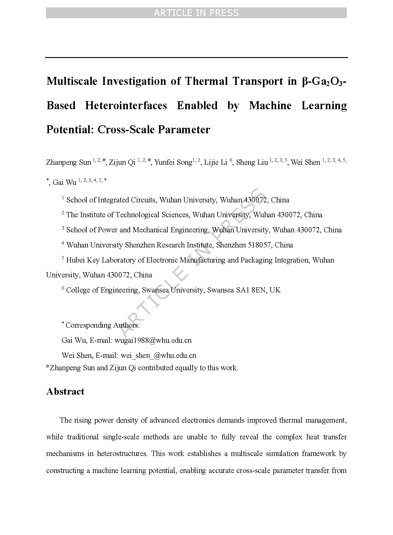 The research group led by Academician Sheng Liu, Associate Professor Gai Wu, and Associate Professor Wei Shen from Wuhan University has published an article entitled “Multiscale investigation of thermal transport in β-Ga2O3-based heterointerfaces enabled by machine learning potential: cross-scale parameter” in the academic journal “npj Computational Materials”.