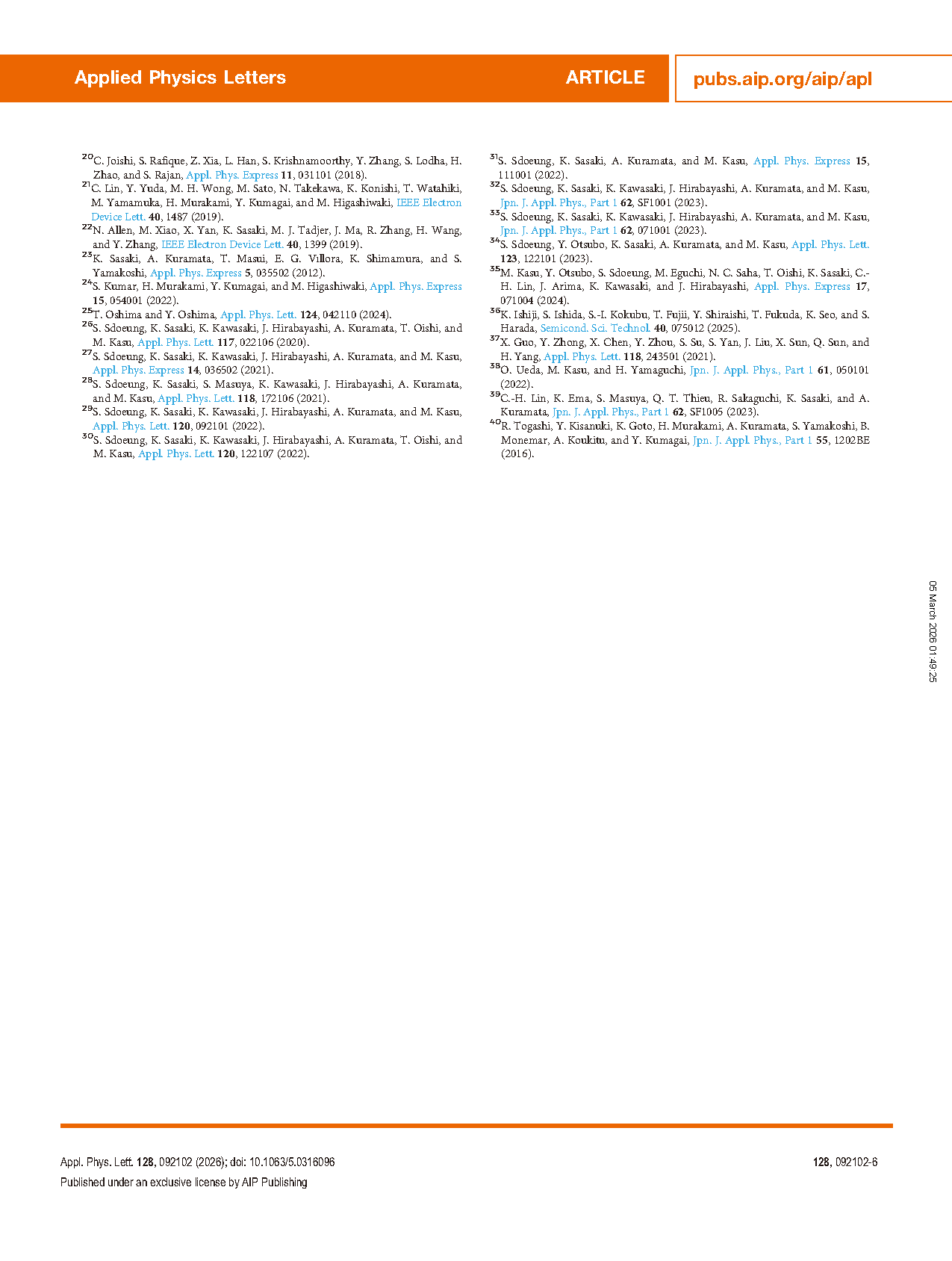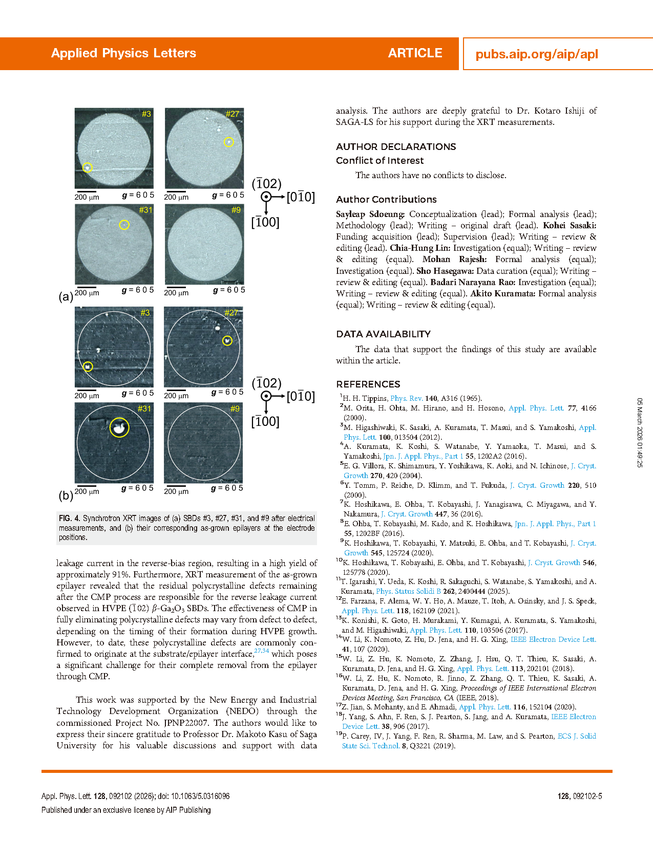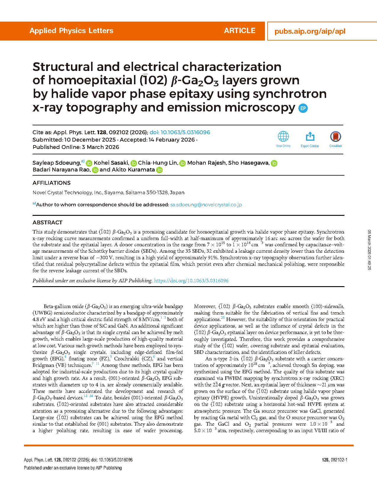 Researchers from the Novel Crystal Technology, Inc. have published a dissertation titled "Structural and electrical characterization of homoepitaxial (-102) β-Ga2O3 layers grown by halide vapor phase epitaxy using synchrotron x-ray topography and emission microscopy" in Applied Physics Letters.
