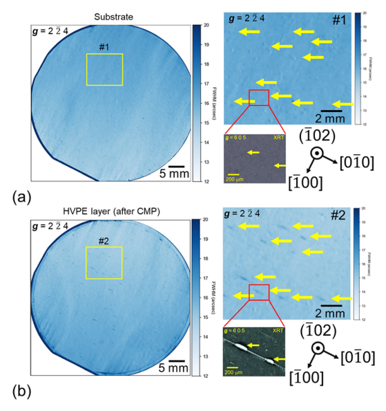 FIG. 1. Synchrotron XRC FWHM mapping images of (a) the substrate and (b) the HVPE layer (after CMP) taken by g vector of 2 -2 4. The yellow arrows highlight the FWHM values at corresponding locations in the substrate and epilayer. XRT images of the red-outlined regions of #1 and #2 were obtained using g vector = 6 0 5 in reflection geometry.