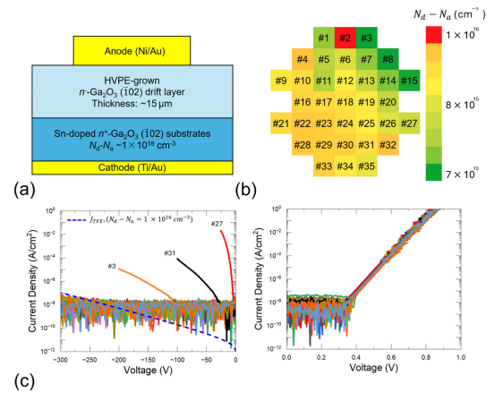 FIG. 2. (a) Cross-sectional view of the HVPE (-102) β-Ga2O3 SBD’s structure, (b) donor concentration mapping obtained by C–V measurements, and (c) J–V characteristics of the 800-μm-diameter SBDs, respectively. The blue-dashed line in the reverse-bias region represents the fitted curve based on the TFE model.