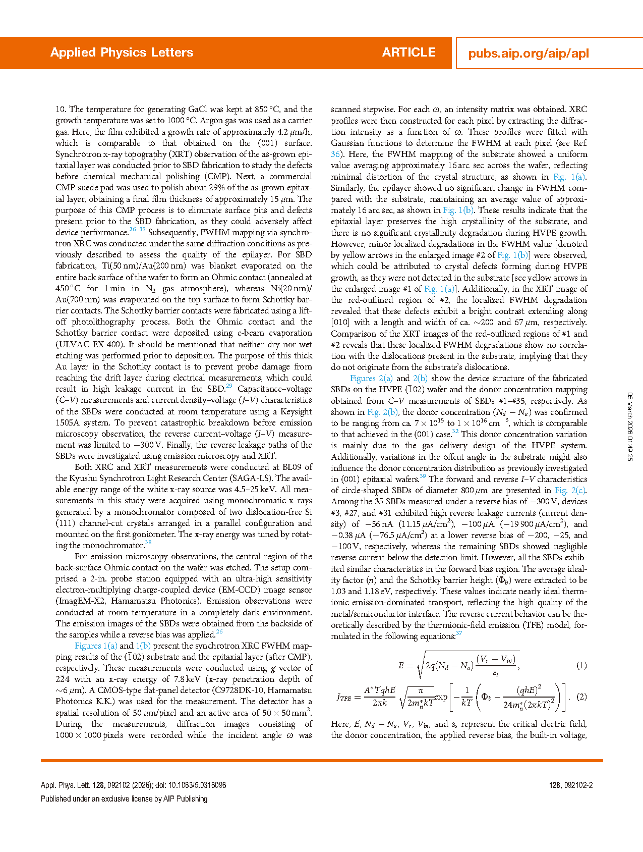 In conclusion, we confirmed that (-102) β-Ga2O3 is a promising candidate for HVPE homoepitaxial growth. Synchrotron XRC measurements confirmed a uniform FWHM of approximately 16 arc sec across the wafer for both the substrate and the epitaxial layer, indicating high crystallinity and showing no significant degradation of crystal quality occurred during HVPE growth. Additionally, C-V measurements of the SBDs revealed a donor concentration ranging from 7 × 1015 to 1 × 1016 cm−3. Among the 35 SBDs, three exhibited high leakage current in the reverse-bias region, resulting in a high yield of approximately 91%. Furthermore, XRT measurement of the as-grown epilayer revealed that the residual polycrystalline defects remaining after the CMP process are responsible for the reverse leakage current observed in HVPE (-102) β-Ga2O3 SBDs. The effectiveness of CMP in fully eliminating polycrystalline defects may vary from defect to defect, depending on the timing of their formation during HVPE growth. However, to date, these polycrystalline defects are commonly confirmed to originate at the substrate/epilayer interface, which poses a significant challenge for their complete removal from the epilayer through CMP.