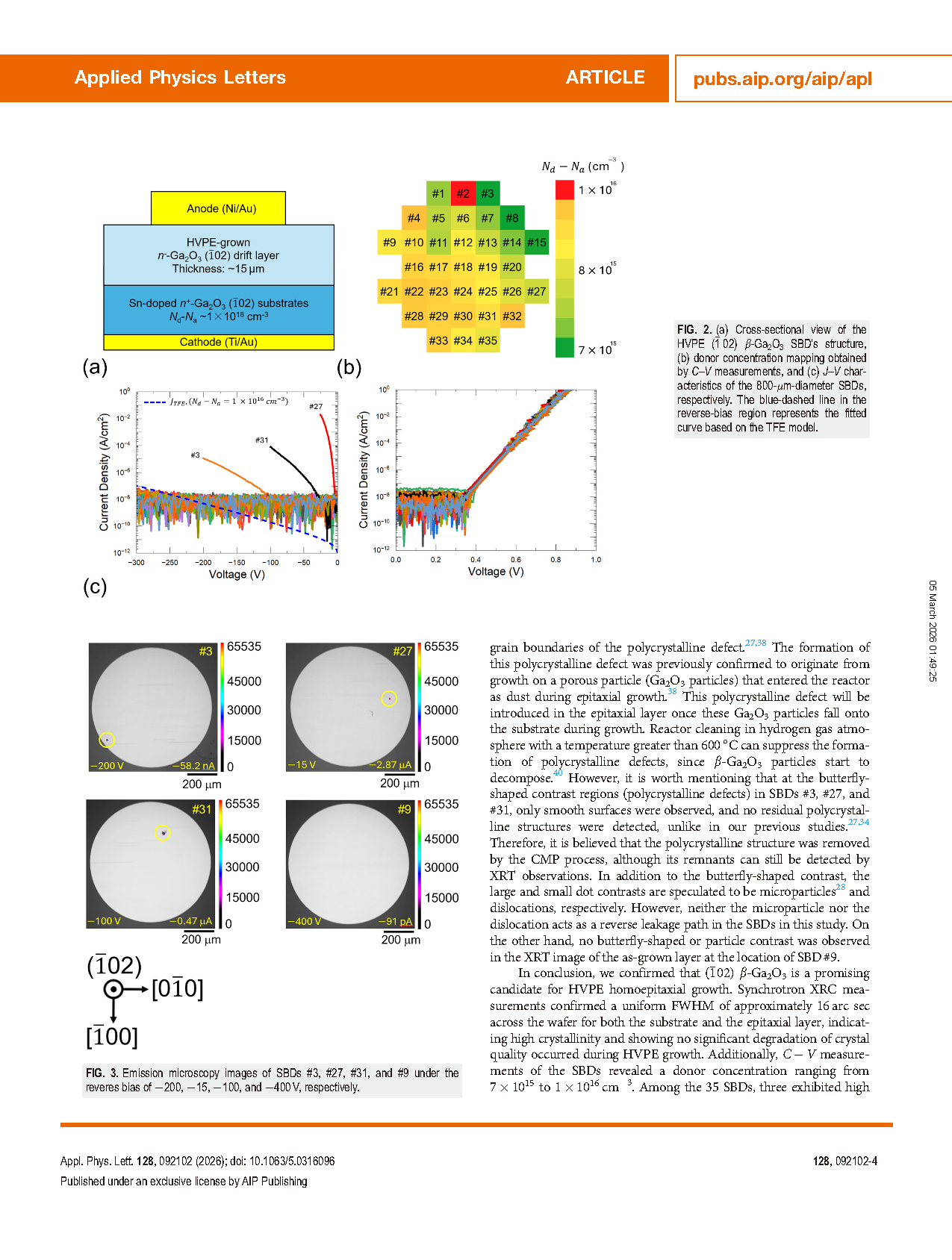 Beta-gallium oxide (β-Ga2O3) is an emerging ultra-wide bandgap (UWBG) semiconductor characterized by a bandgap of approximately 4.8 eV and a high critical electric field strength of 8MV/cm, both of which are higher than those of SiC and GaN. An additional significant advantage of β-Ga2O3 is that its single crystal can be achieved by melt growth, which enables large-scale production of high-quality material at low cost. Various melt-growth methods have been employed to synthesize β-Ga2O3 single crystals, including edge-defined film-fed growth (EFG), floating zone (FZ), Czochralski (CZ), and vertical Bridgman (VB) techniques.7–11 Among these methods, EFG has been adopted for industrial-scale production due to its high crystal quality and high growth rate. As a result, (001)-oriented β-Ga2O3 EFG substrates with diameters up to 4 in. are already commercially available. These merits have accelerated the development and research of β-Ga2O3-based devices. To date, besides (001)-oriented β-Ga2O3 substrates, (-102)-oriented substrates have also attracted considerable attention as a promising alternative due to the following advantages: Large-size (-102) substrates can be achieved using the EFG method similar to that established for (001) substrates. They also demonstrate a higher polishing rate, resulting in ease of wafer processing. Moreover, (-102) β-Ga2O3 substrates enable smooth (100)-sidewalls, making them suitable for the fabrication of vertical fins and trench applications. However, the suitability of this orientation for practical device applications, as well as the influence of crystal defects in the (-102) β-Ga2O3 epitaxial layer on device performance, is yet to be thoroughly investigated. Therefore, this work provides a comprehensive study of the (-102) wafer, covering substrate and epitaxial evaluation, SBD characterization, and the identification of killer defects.