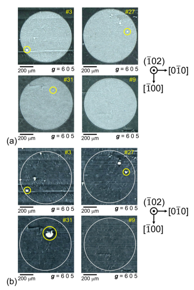 FIG. 4. Synchrotron XRT images of (a) SBDs #3, #27, #31, and #9 after electrical measurements, and (b) their corresponding as-grown epilayers at the electrode positions.