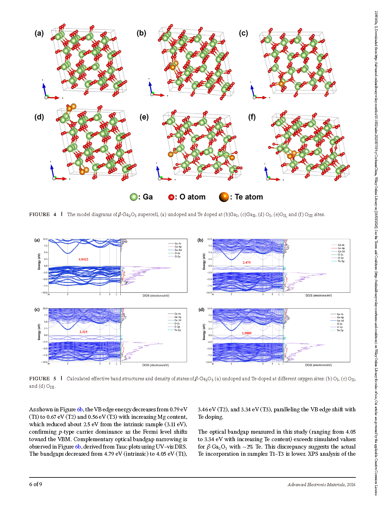 FIGURE 5. Calculated effective band structures and density of states of β-Ga2O3 (a) undoped and Te-doped at different oxygen sites: (b) OI, (c) OII, and (d) OIII.