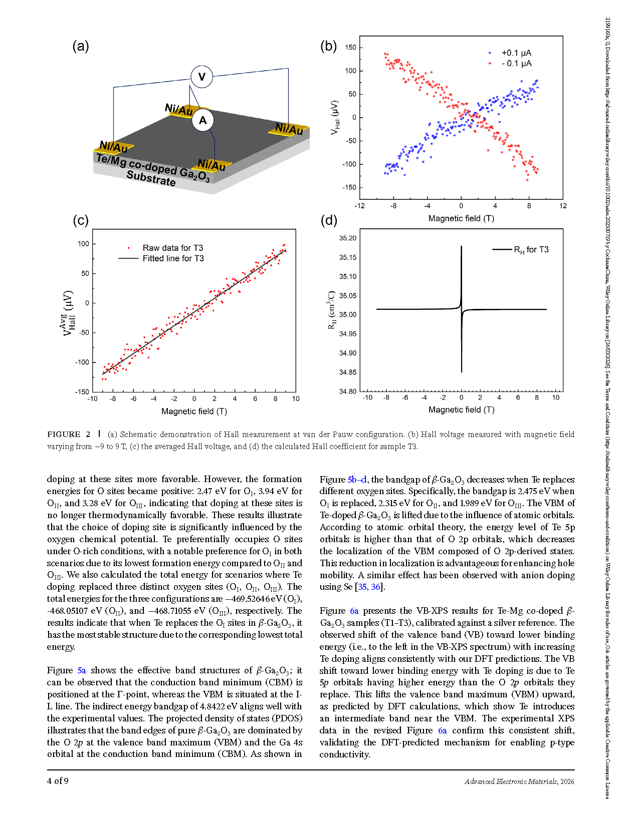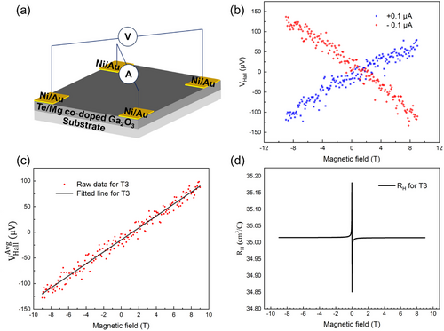 FIGURE 2. (a) Schematic demonstration of Hall measurement at van der Pauw configuration. (b) Hall voltage measured with magnetic field varying from −9 to 9 T, (c) the averaged Hall voltage, and (d) the calculated Hall coefficient for sample T3.