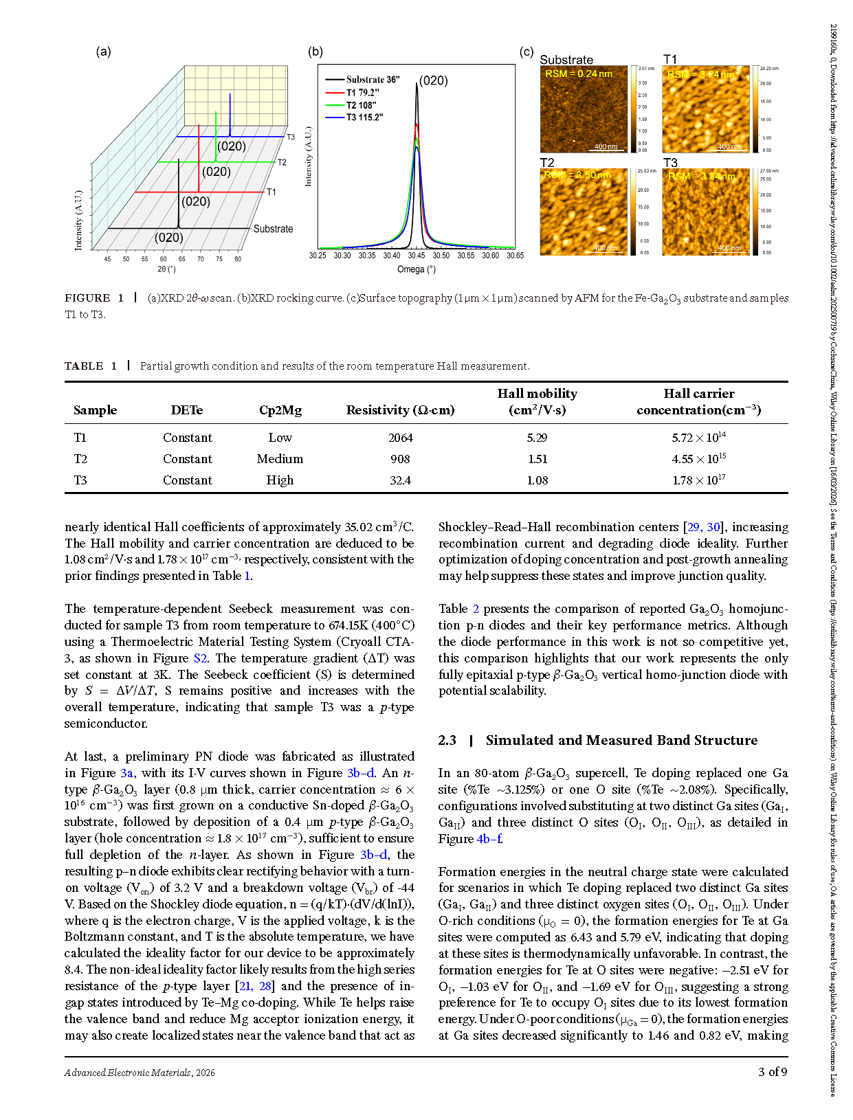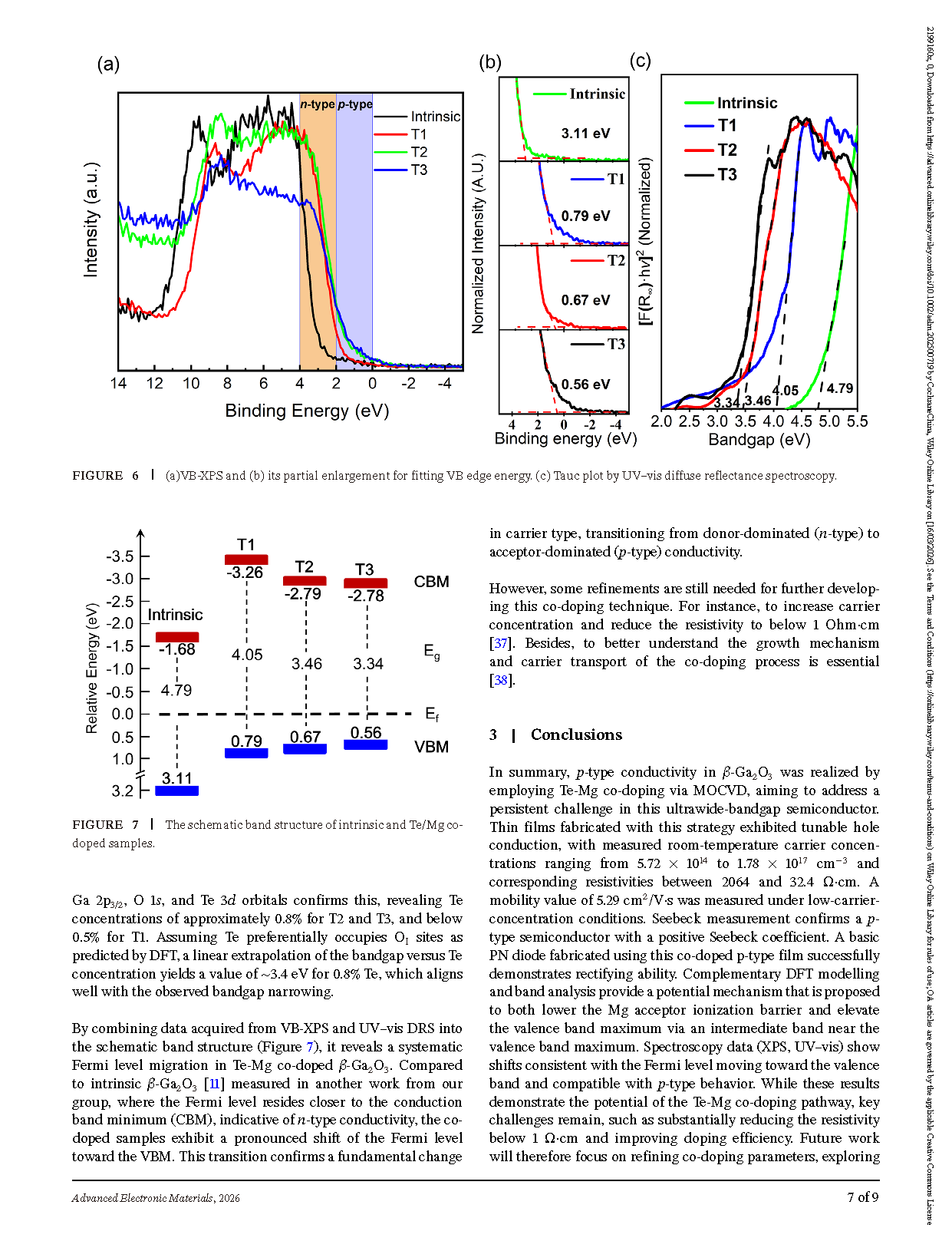 In summary, p-type conductivity in β-Ga2O3 was realized by employing Te-Mg co-doping via MOCVD, aiming to address a persistent challenge in this ultrawide-bandgap semiconductor. Thin films fabricated with this strategy exhibited tunable hole conduction, with measured room-temperature carrier concentrations ranging from 5.72 × 1014 to 1.78 × 1017 cm−3 and corresponding resistivities between 2064 and 32.4 Ω·cm. A mobility value of 5.29 cm2/V·s was measured under low-carrier-concentration conditions. Seebeck measurement confirms a p-type semiconductor with a positive Seebeck coefficient. A basic PN diode fabricated using this co-doped p-type film successfully demonstrates rectifying ability. Complementary DFT modelling and band analysis provide a potential mechanism that is proposed to both lower the Mg acceptor ionization barrier and elevate the valence band maximum via an intermediate band near the valence band maximum. Spectroscopy data (XPS, UV–vis) show shifts consistent with the Fermi level moving toward the valence band and compatible with p-type behavior. While these results demonstrate the potential of the Te-Mg co-doping pathway, key challenges remain, such as substantially reducing the resistivity below 1 Ω·cm and improving doping efficiency. Future work will therefore focus on refining co-doping parameters, exploring post-growth treatments, and pursuing robust electrical validation. This study offers a pathway toward achieving p-type β-Ga2O3.