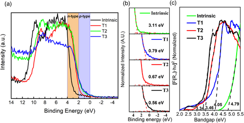 FIGURE 6. (a)VB-XPS and (b) its partial enlargement for fitting VB edge energy. (c) Tauc plot by UV–vis diffuse reflectance spectroscopy.