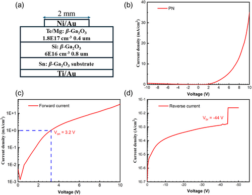 FIGURE 3. (a) Schematic structure of the PN diode. I–V curve from −10 to 10V (b), forward current of the PN diode (c), and reverse current of the PN diode (d).
