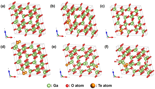 FIGURE 4. The model diagrams of β-Ga2O3 supercell, (a) undoped and Te doped at (b)GaI, (c)GaII, (d) OI, (e)OII, and (f) OIII sites.