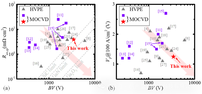 近日,基于杭州富加镓业科技有限公司(以下简称富加镓业)提供的高质量MOCVD厚膜外延片,福州大学团队成功制备出高性能氧化镓垂直型功率肖特基二极管,在公开发表的基于MOCVD外延制备的功率肖特基二极管中,PFOM性能国际最优(3.07 GW/cm2);从产业应用角度,在公开发表的基于MOCVD和HVPE外延制备的氧化镓功率肖特基二极管中,导通电压与耐压的综合性能最优。该工作于2025年9月2日发表在 Applied Physics Letters (https://doi.org/10.1063/5.0276330) 上。