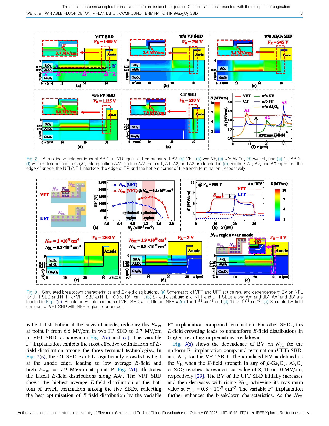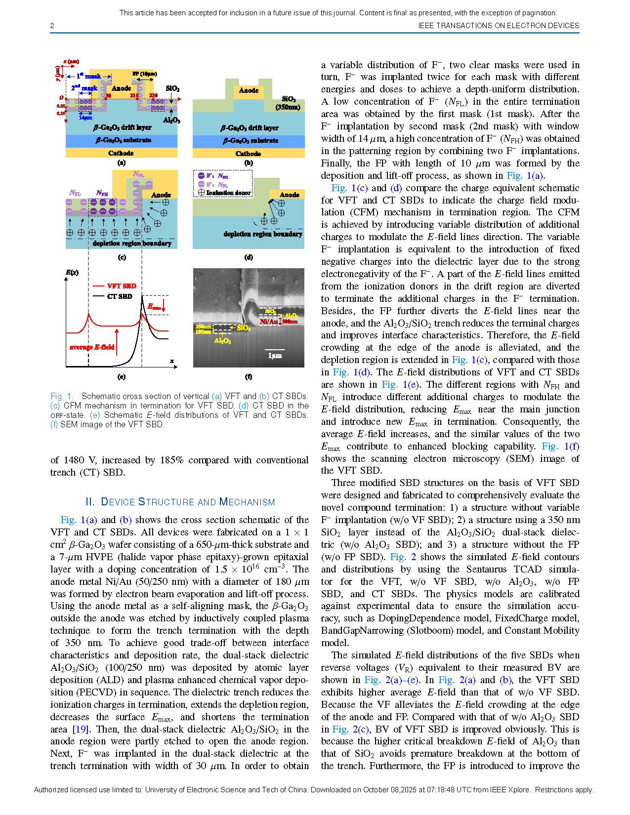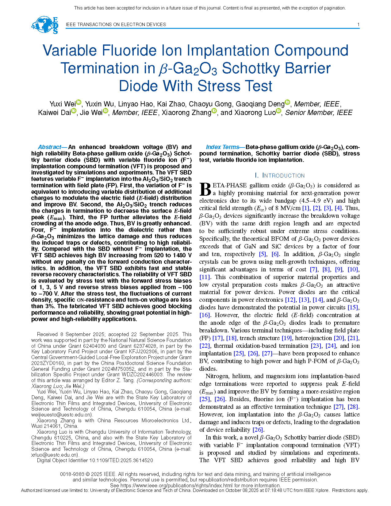 由电子科技大学罗小蓉教授的研究团队在学术期刊 IEEE Transactions on Electron Devices 发布了一篇名为 Variable Fluoride Ion Implantation Compound Termination in β-Ga2O3 Schottky Barrier Diode With Stress Test (具有变注入氟离子复合终端的 β-Ga2O3 SBD 与应力测试)的文章,魏雨夕博士后为论文第一作者,罗小蓉教授和魏杰研究员为论文通讯作者。