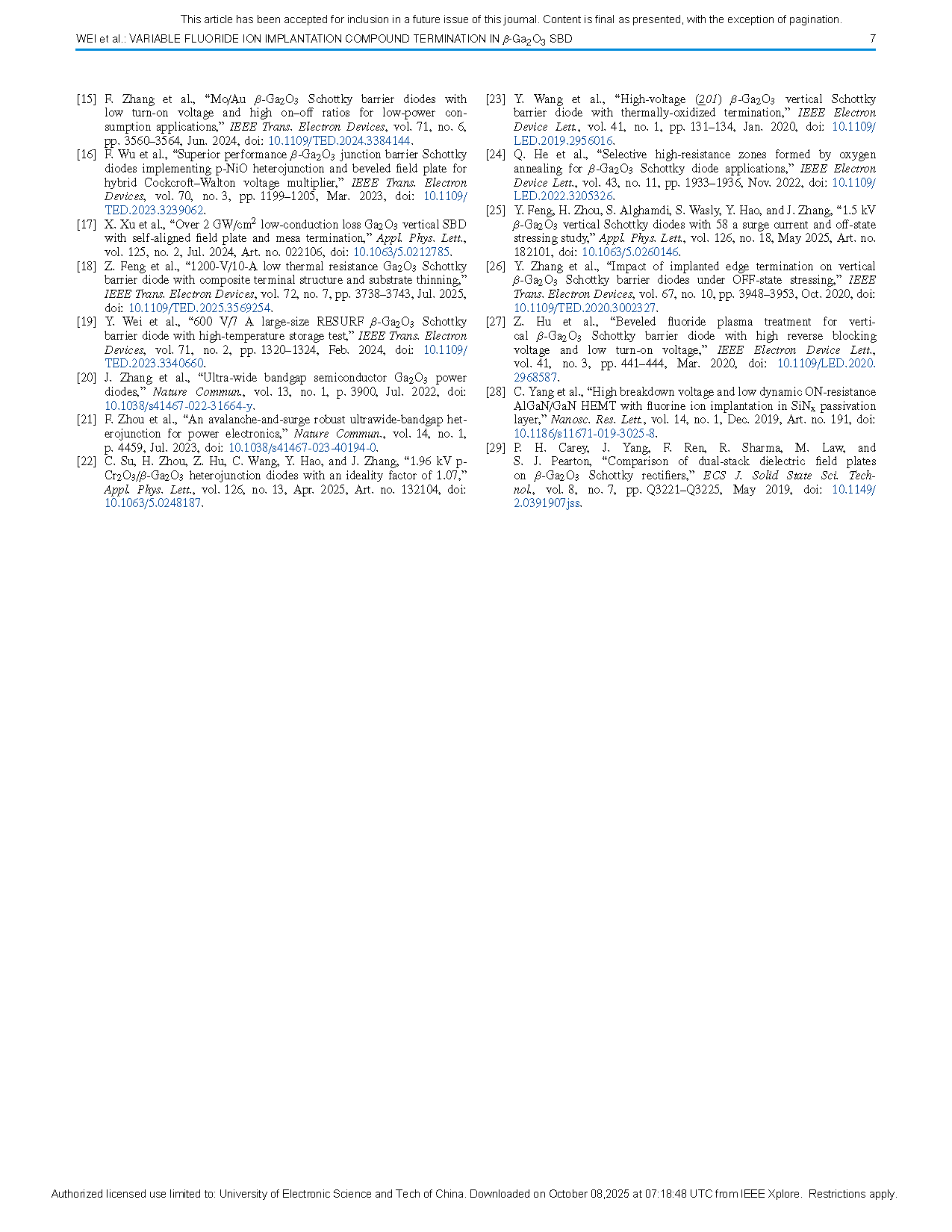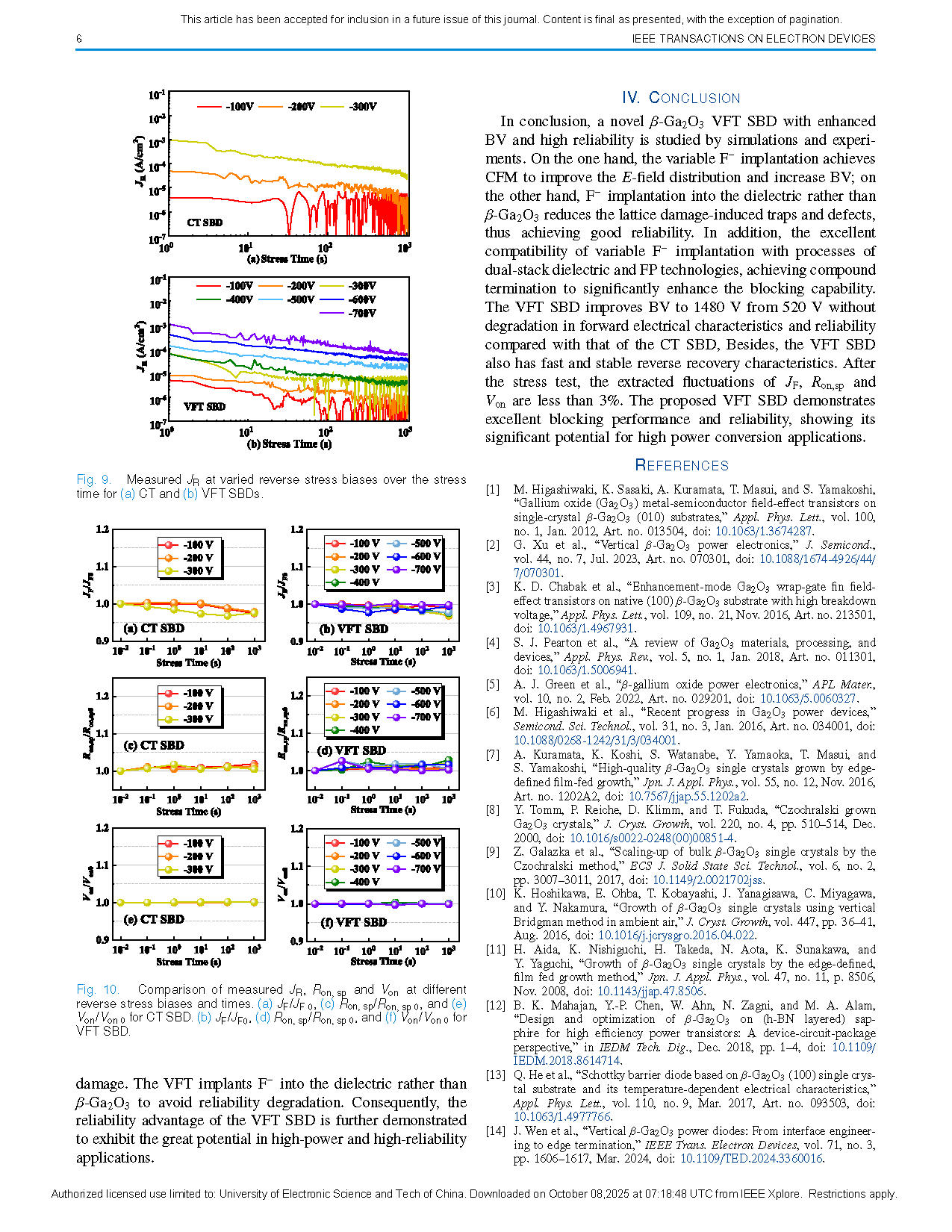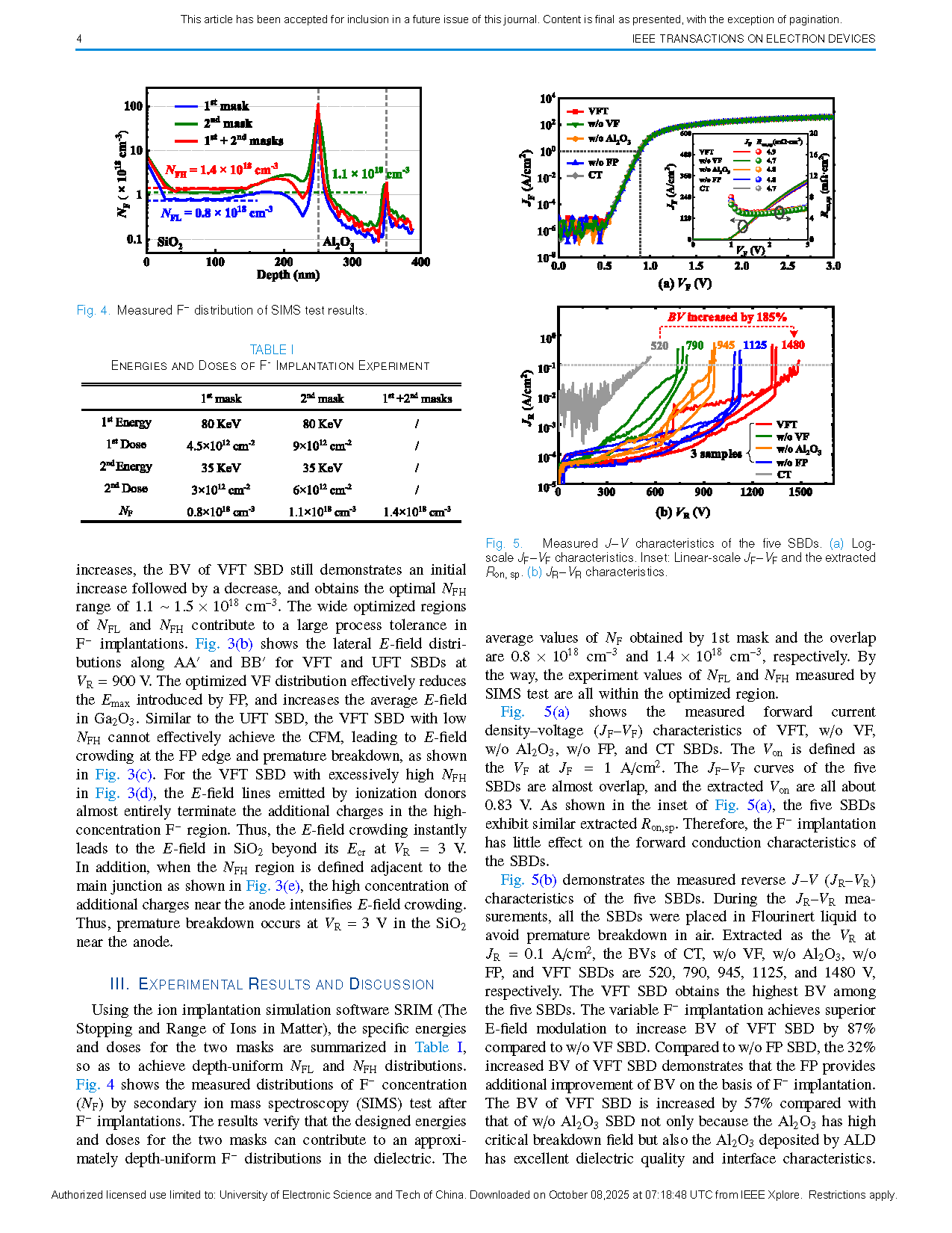 由电子科技大学罗小蓉教授的研究团队在学术期刊 IEEE Transactions on Electron Devices 发布了一篇名为 Variable Fluoride Ion Implantation Compound Termination in β-Ga2O3 Schottky Barrier Diode With Stress Test (具有变注入氟离子复合终端的 β-Ga2O3 SBD 与应力测试)的文章,魏雨夕博士后为论文第一作者,罗小蓉教授和魏杰研究员为论文通讯作者。