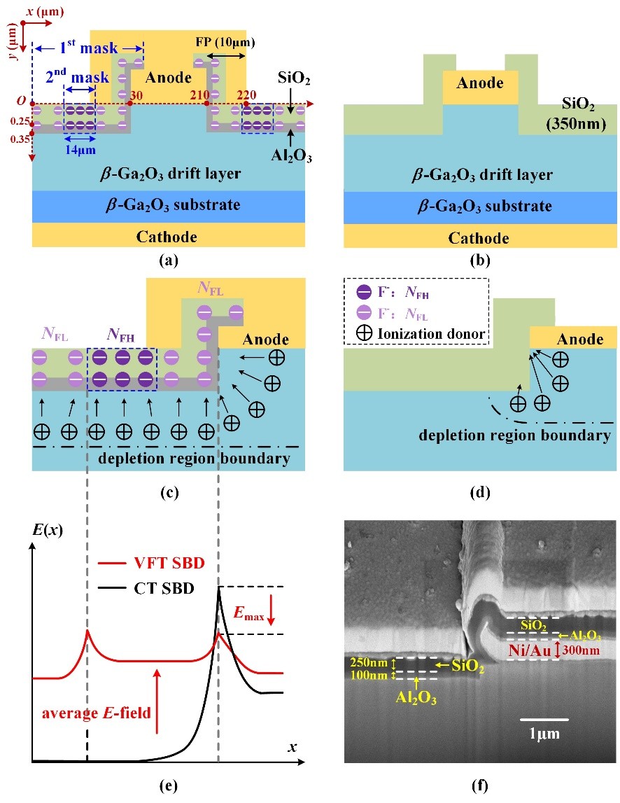研究团队通过仿真与实验研究,提出并验证了一种具有变注入氟离子复合终端(variable fluoride ion F⁻ implantation compound termination, VFT)的氧化镓肖特基势垒二极管,该器件具有高击穿电压和高可靠性。VFT 终端的结构特征为:在 Al2O3/SiO2 槽型终端中具有变注入的氟离子,同时引入场板。新结构的创新机理为:其一,氟离子变注入等效于引入变分布的附加电荷,可有效调制电场分布以提高击穿电压;其二,Al2O3/SiO2 复合介质沟槽减少终端区域的电荷数量,从而降低表面电场峰值;其三,场板结构可进一步缓解阳极边缘的电场集中现象。以上三重优势显著增强器件击穿特性。其四,将氟离子注入介质层而非 β-Ga2O3 中,最大程度避免了 β-Ga2O3 晶格损伤,显著减少陷阱与缺陷的产生,从而保证了器件的高可靠性。