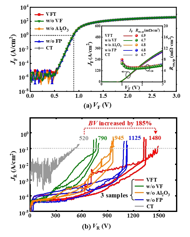 图1. (a) VFT 与(b) CT SBDs 的垂直截面示意图;(c) VFT SBD 终端区域的电荷场调制机理;(d) 关态下的 CT SBD;(e) VFT 与 CT SBDs 的电场分布示意图;(f) VFT SBD 的扫描电镜图像。