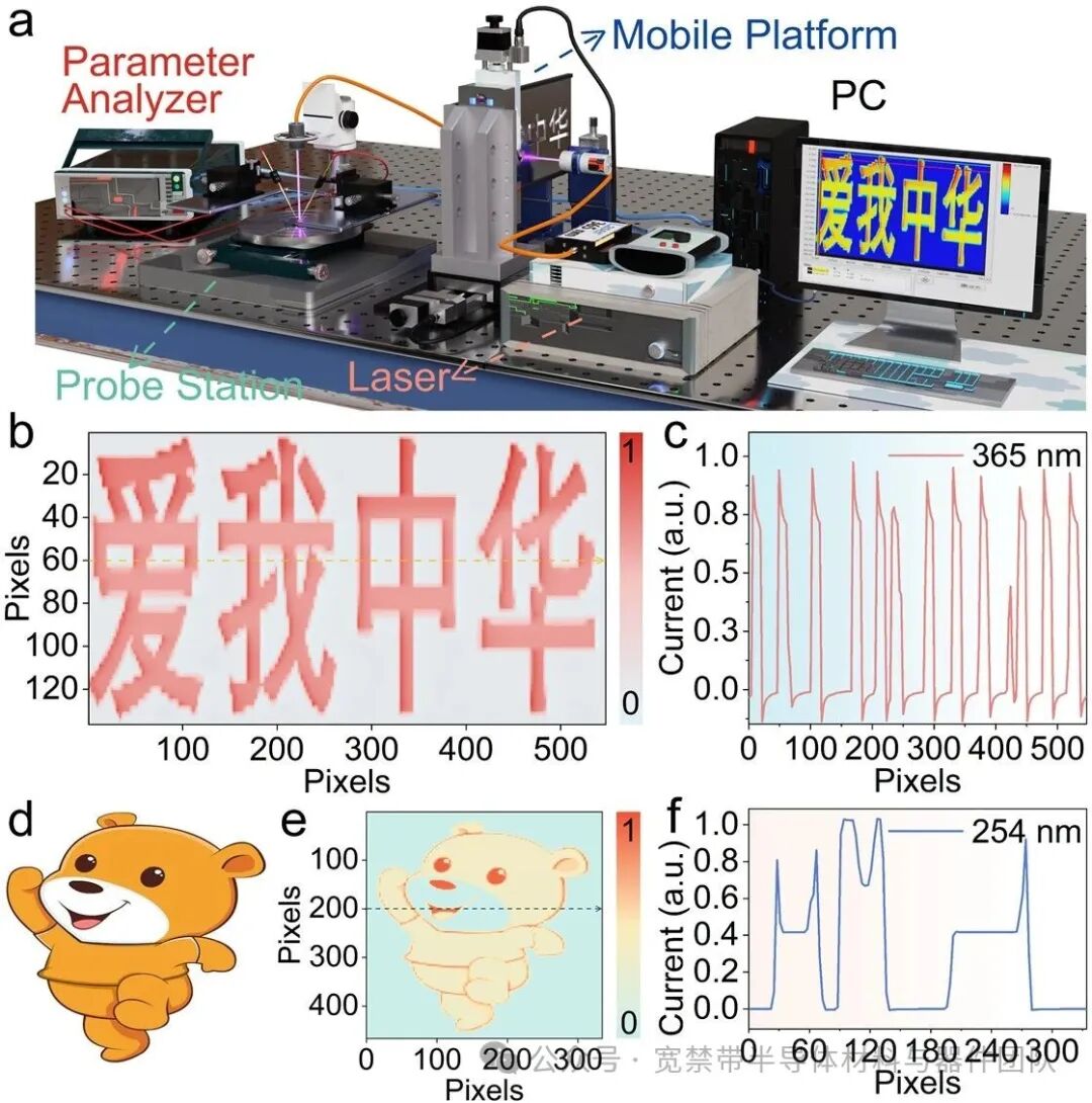Fig. 5. (a) Schematic of the device integrated into a single-pixel imaging system. (b) Imaging of the Chinese characters “爱我中华” under 365 nm UV. (c) Photocurrent profile during horizontal scanning at the 60th vertical pixel under 365 nm UV illumination. (d) Imaging of a bear-shaped pattern under 254 nm UV. (e) Photocurrent profile during horizontal scanning at the 200th vertical pixel under 254 nm UV illumination.
