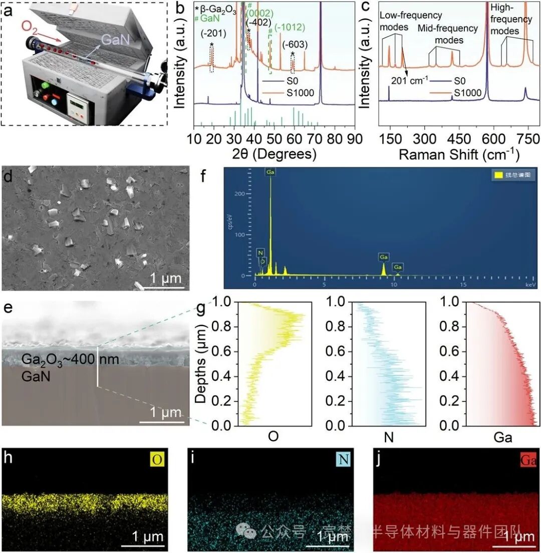 Fig. 1. (a) Thermal oxidation of a GaN thin film in a tube furnace. (b) XRD of S0 (pre-oxidation) and S1000 (oxidized at 1000 °C). (c) Raman spectra of S0 and S1000. (d, e) Surface and cross-sectional SEM of S1000. (f) EDS spectra of S1000. (g–j) Line-scan profiles and elemental maps of O, N, and Ga in the cross-section of S1000.