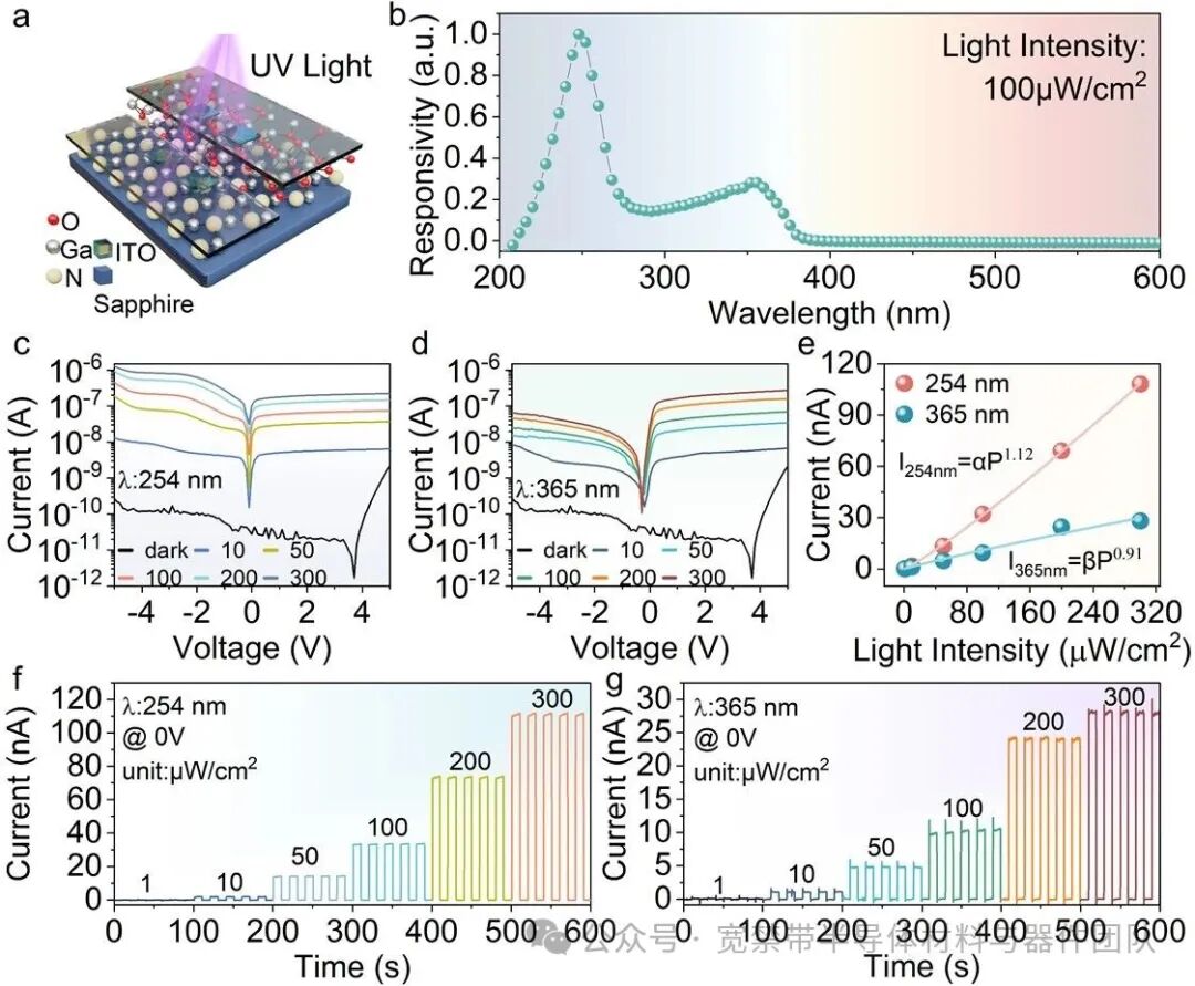 Fig. 3. (a) Schematic of the self-powered Ga2O3/GaN heterojunction photodetector. (b) Spectral responsivity at 0 V. (c) I–V curves under 254 nm illumination with varying power densities. (d) I–V curves under 365 nm illumination with varying power densities. (e) Power-law fitting of photocurrent versus power density at 254 and 365 nm (0 V). (f) I–T curve under 254 nm at 0 V. (g) I–T curve under 365 nm at 0 V.