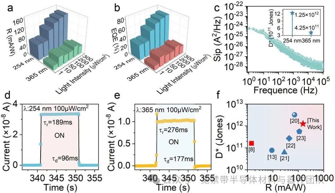 Fig. 4. (a)-(b) R and EQE under 254 nm and 365 nm illumination. (c) Noise power spectral density; the inset (top right) shows the calculated D* derived from the noise spectrum. (d)-(e) Temporal response (rise/fall time) under 254 nm and 365 nm illumination, respectively. (f) Comparison of R and D* for comparable photodetectors.