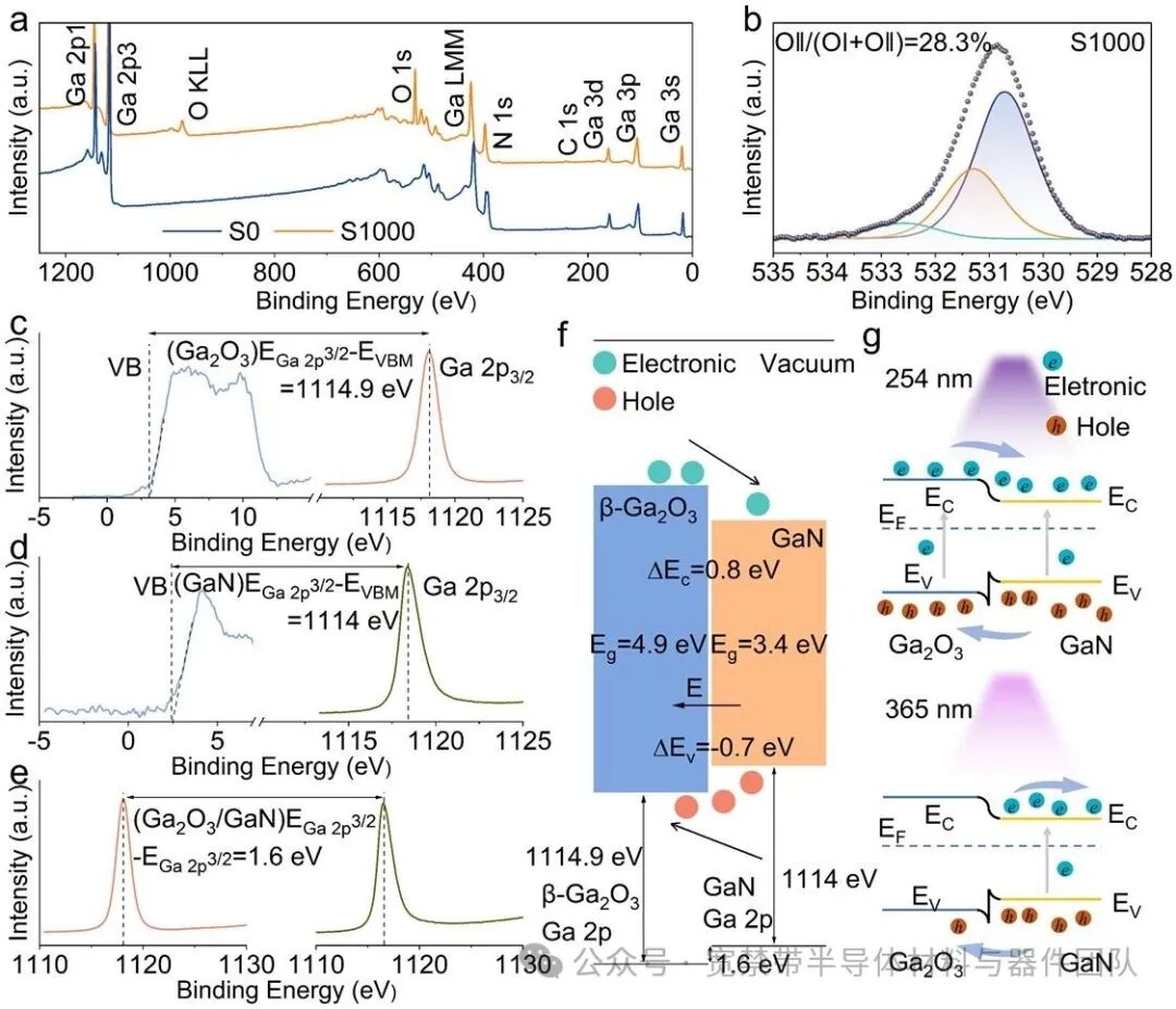 Fig. 2. (a) XPS survey of S0 and S1000. (b) O 1s spectrum of S1000 with peak fitting. (c) Ga 2p3/2 and valence band spectra of S1000. (d) Ga 2p3/2 and valence band spectra of S0. (e) Ga 2p3/2 spectra of S0 and S1000. (f) Band alignment diagram of the β-Ga2O3/GaN heterojunction. (g) Carrier transport mechanisms under 254 and 365 nm UV illumination.