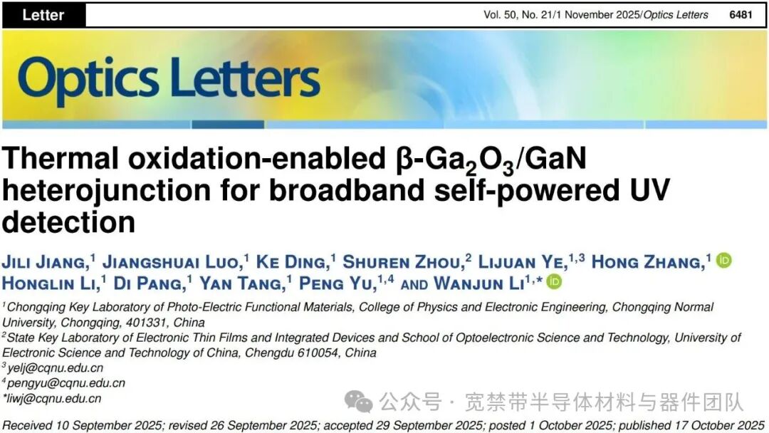 重庆师范大学李万俊教授团队(宽带隙半导体材料与器件团队)在热氧化制备β-Ga2O3/GaN异质结及其宽光谱自供电紫外探测研究中取得进展。相关成果以“Thermal Oxidation–Enabled β-Ga2O3/GaN Heterojunction for Broadband Self-Powered UV Detection”为题发表在《Optics Letters》杂志上。团队研究生蒋佶利为第一作者,叶利娟副教授、余鹏教授和李万俊教授为共同通讯作者。