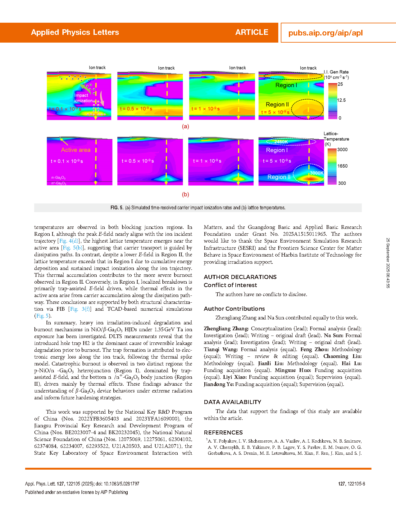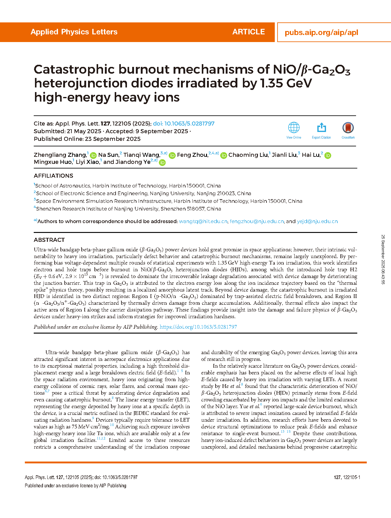 由哈尔滨工业大学与南京大学组成研究团队在学术期刊 Applied Physics Letters 发布了一篇名为 Catastrophic burnout mechanisms of NiO/β-Ga2O3 heterojunction diodes irradiated by 1.35 GeV high-energy heavy ions(1.35 GeV 高能重离子辐照下 NiO/β-Ga2O3 异质结二极管的灾难性烧毁机制)的文章。