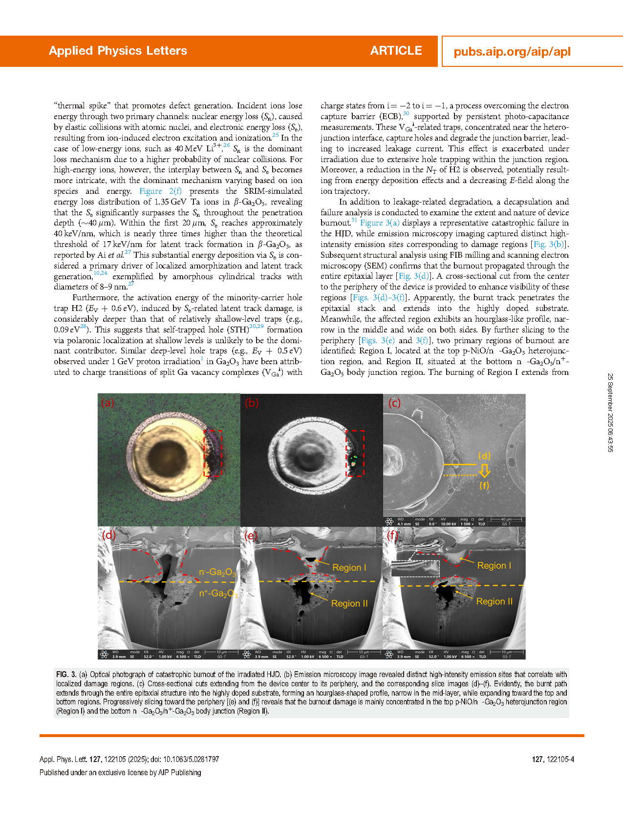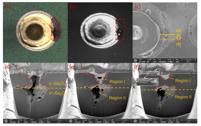图3. (a) 辐照 HJD 器件灾难性烧毁的光学照片。(b) 发射显微镜图像显示出与局部损伤区域对应的明显高强度发射点。(c) 从器件中心延伸至边缘的横截面剖切图及对应切片图像 (d)–(f)。可见烧蚀路径贯穿整个外延结构深入高掺杂衬底,形成沙漏状轮廓:中间层狭窄,顶底区域逐渐扩张。向外围逐步切片(图 (e) 和 (f))显示,烧毁损伤主要集中于顶部的 p-NiO/n--Ga2O3 异质结区域(区域 I)和底部的n--Ga2O3/n+-Ga2O3体结(区域 II)。