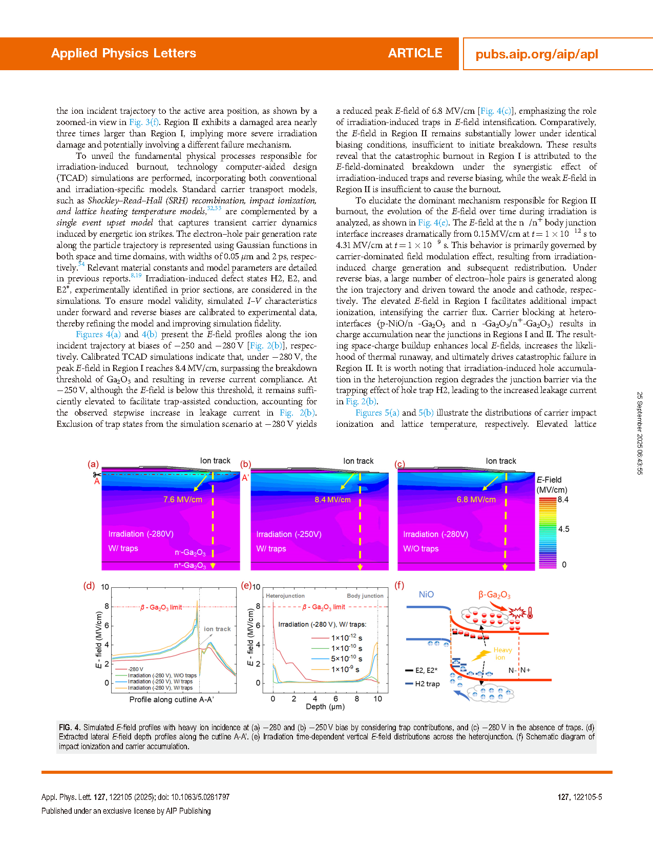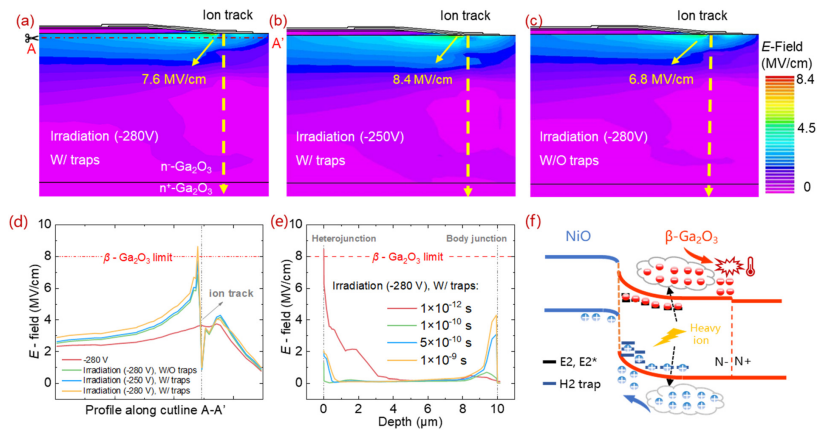 图4. 考虑陷阱效应时,重离子入射下 (a) 280 V 和 (b) 250 V 偏压下的模拟电场分布,以及 (c) 280 V 无陷阱条件下的分布。(d) 沿剖面线 A-A' 提取的横向电场深度分布。(e) 异质结跨接区域随辐照时间变化的垂直电场分布。(f) 碰撞电离与载流子积累示意图。