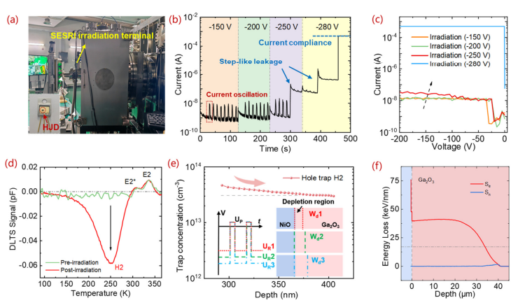 图2. (a) SESRI 重离子辐照实验终端及待测器件。 (b) 在 3 秒重离子束脉冲、12 秒周期条件下,离子入射时的瞬态漏电流曲线。 (c) 辐照后 HJD 在不同偏压下的漏电流曲线。(d) 器件在 -250 V 偏压下(UR=5 V,UP=0.1 V)辐照前后的 DLTS 谱图。(e) β-Ga2O3 中空穴陷阱 H2 的浓度随深度变化曲线。(f) 由 SRIM 程序模拟的 Sn 和 Se 特性曲线。