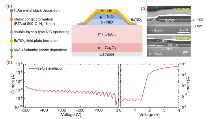 图1. (a) NiO/β-Ga2O3 高能离子掺杂器件(HJD)的工艺流程图及示意结构。(b) 制备器件的截面 SEM 图像。(c) 重离子辐照前制备 HJD 器件的正向与反向 I-V 特性曲线。反向漏电流曲线中的电流振荡源于仪器测量限制。