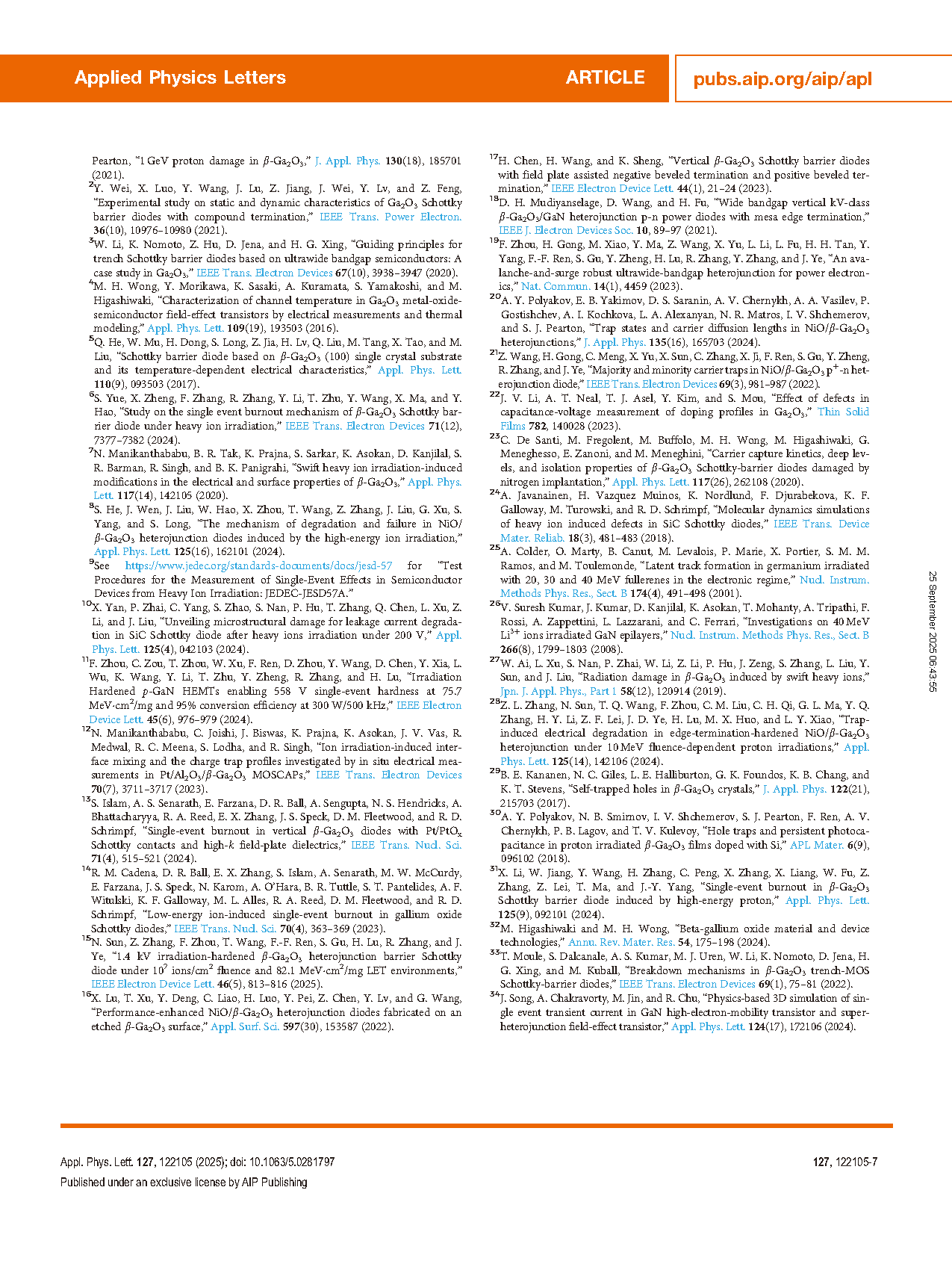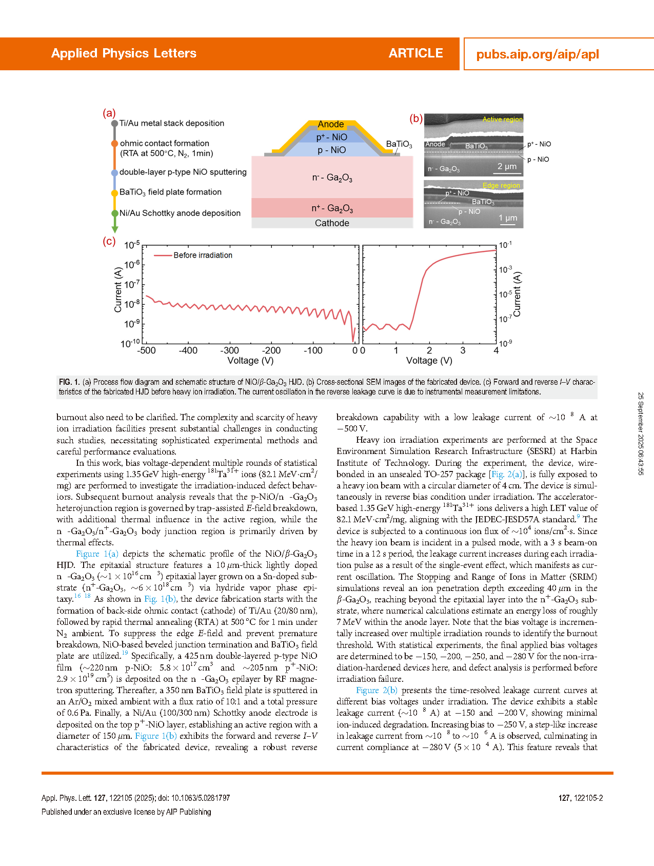 【会员论文】南京大学叶建东教授&哈工大团队:1.35 GeV高能重离子辐照下NiO/β-Ga₂O₃异质结二极管的灾难性烧毁机制