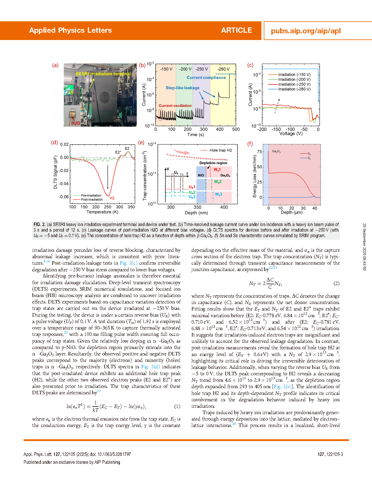 •通过 DLTS 实验,在重离子辐照的 Ga2O3 器件中识别出导致漏电劣化的关键缺陷,并将其与“热钉”模型和电子能损关联,阐明了烧毁前不可恢复损伤的物理起源。