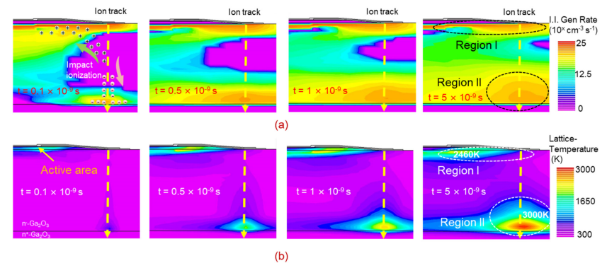 图5. (a) 模拟的时分辨载流子碰撞电离速率和 (b) 晶格温度。