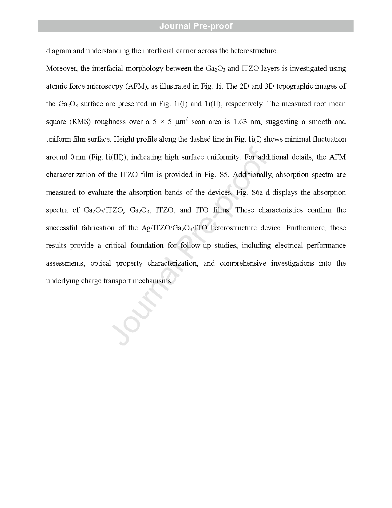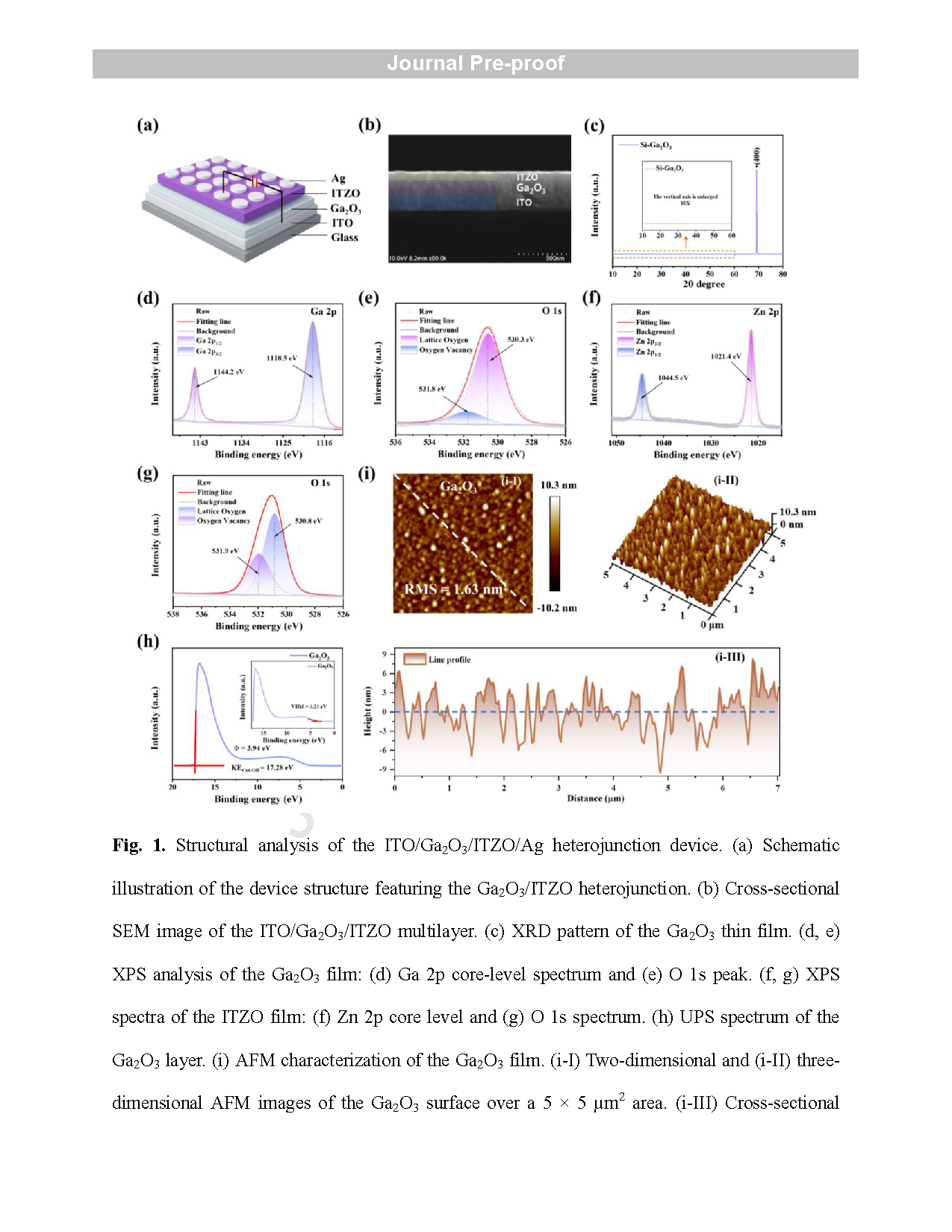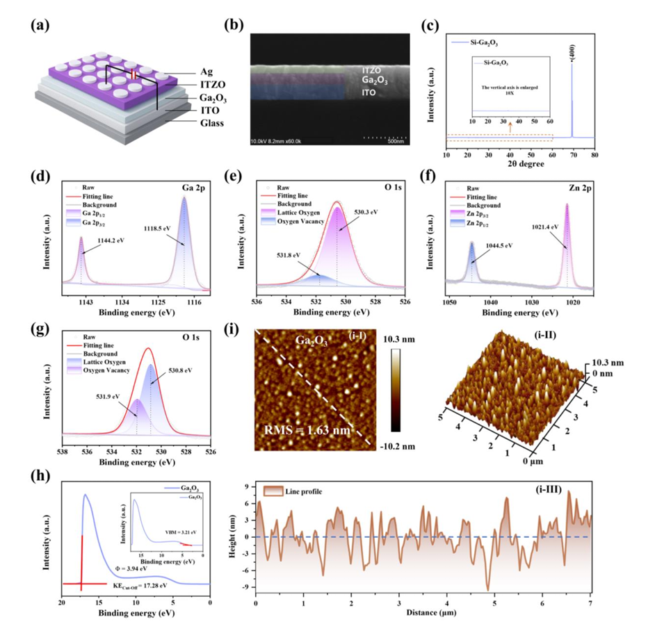 图 1. ITO/Ga₂O₃/ITZO/Ag 异质结器件的结构分析。(a) 器件结构示意图,突出显示 Ga₂O₃/ITZO 异质结(b) ITO/Ga₂O₃/ITZO 多层的横截面 SEM 图像。(c) Ga₂O₃ 薄膜的 XRD 图谱。(d, e) Ga₂O₃ 薄膜的 XPS 分析:(d) Ga 2p 核能级谱,(e) O 1s 峰。(f, g) ITZO 薄膜的 XPS 光谱:(f) Zn 2p 核能级,(g) O 1s 光谱。(h) Ga₂O₃ 薄膜的 UPS 光谱。(i) Ga₂O₃ 薄膜的 AFM 表征。(i-I) Ga₂O₃ 表面二维 AFM 图,(i-II) 三维 AFM 图,扫描范围为 5 × 5 µm²。(i-III) 沿 (i-I) 中白色虚线提取的截面高度剖面。