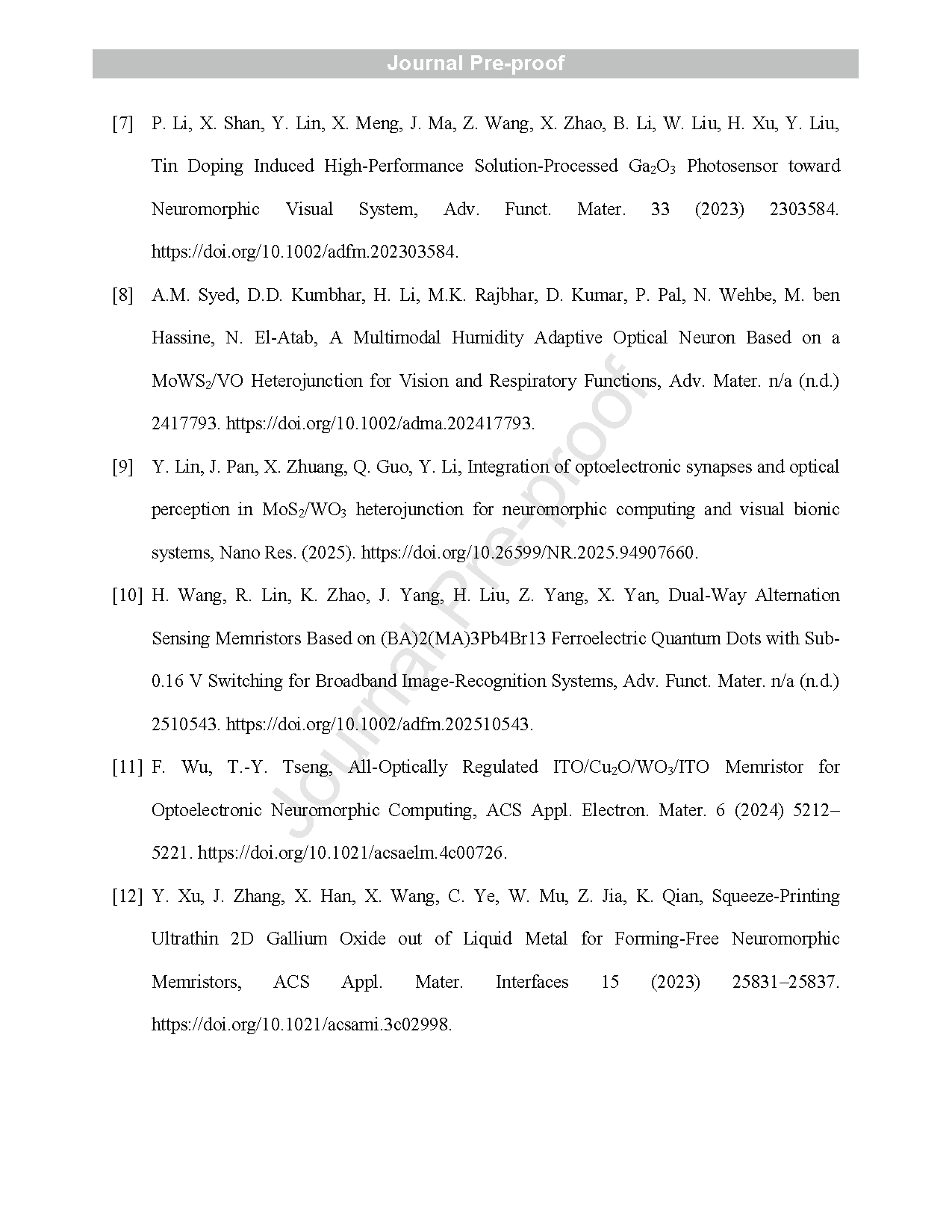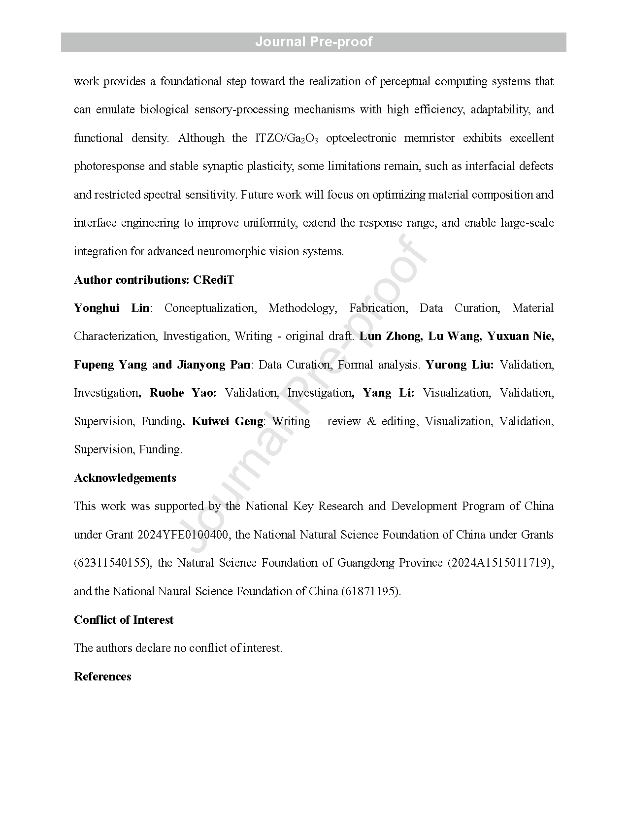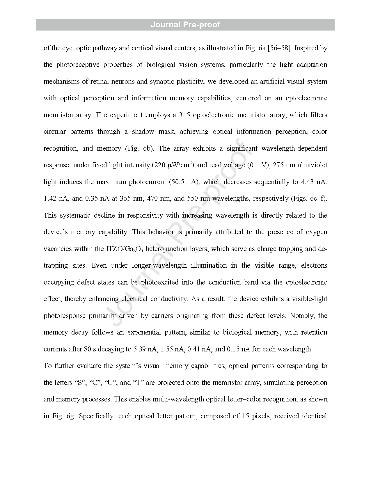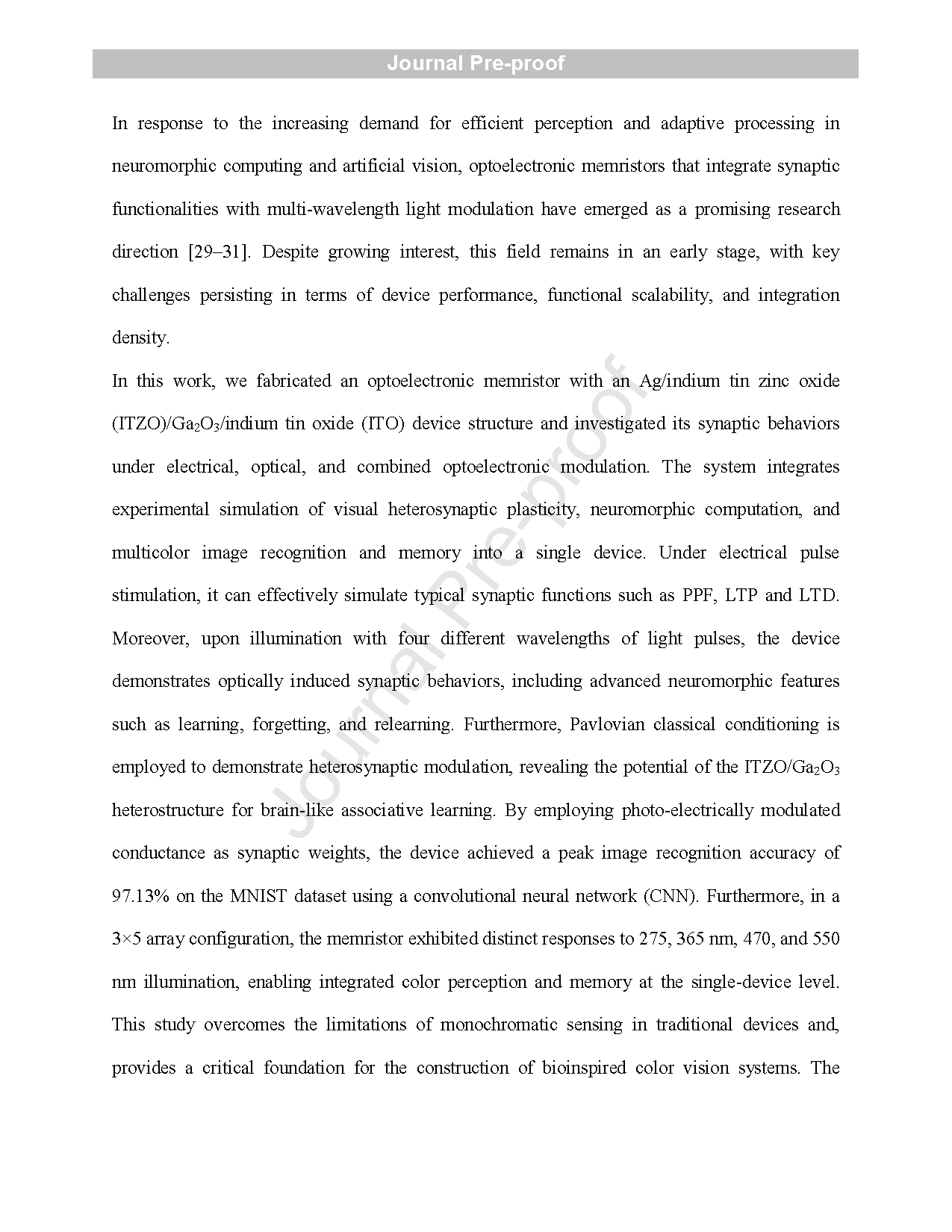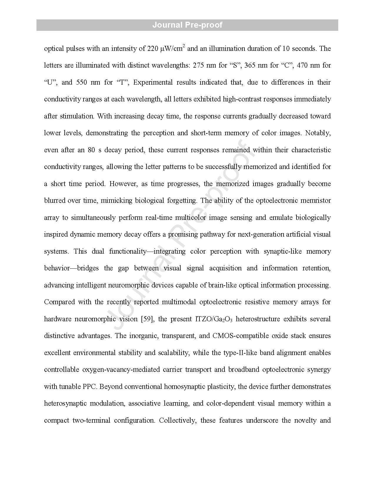 这些结果凸显了该器件在未来类脑视觉系统中的潜力。总体而言,在单一光电忆阻器平台上成功集成复杂关联学习、类脑计算以及感知–记忆耦合功能,为下一代智能电子器件的发展提供了重要支撑。该工作为实现高效、可适应、功能密集的类生物感知计算系统奠定了基础。尽管 ITZO/Ga2O3 光电忆阻器展现出优异的光响应与稳定的突触可塑性,但仍存在界面缺陷及光谱响应范围有限等问题。未来工作将着重于优化材料组成和界面工程,以提升均匀性、拓宽响应范围,并实现大规模集成,推动先进类脑视觉系统的发展。