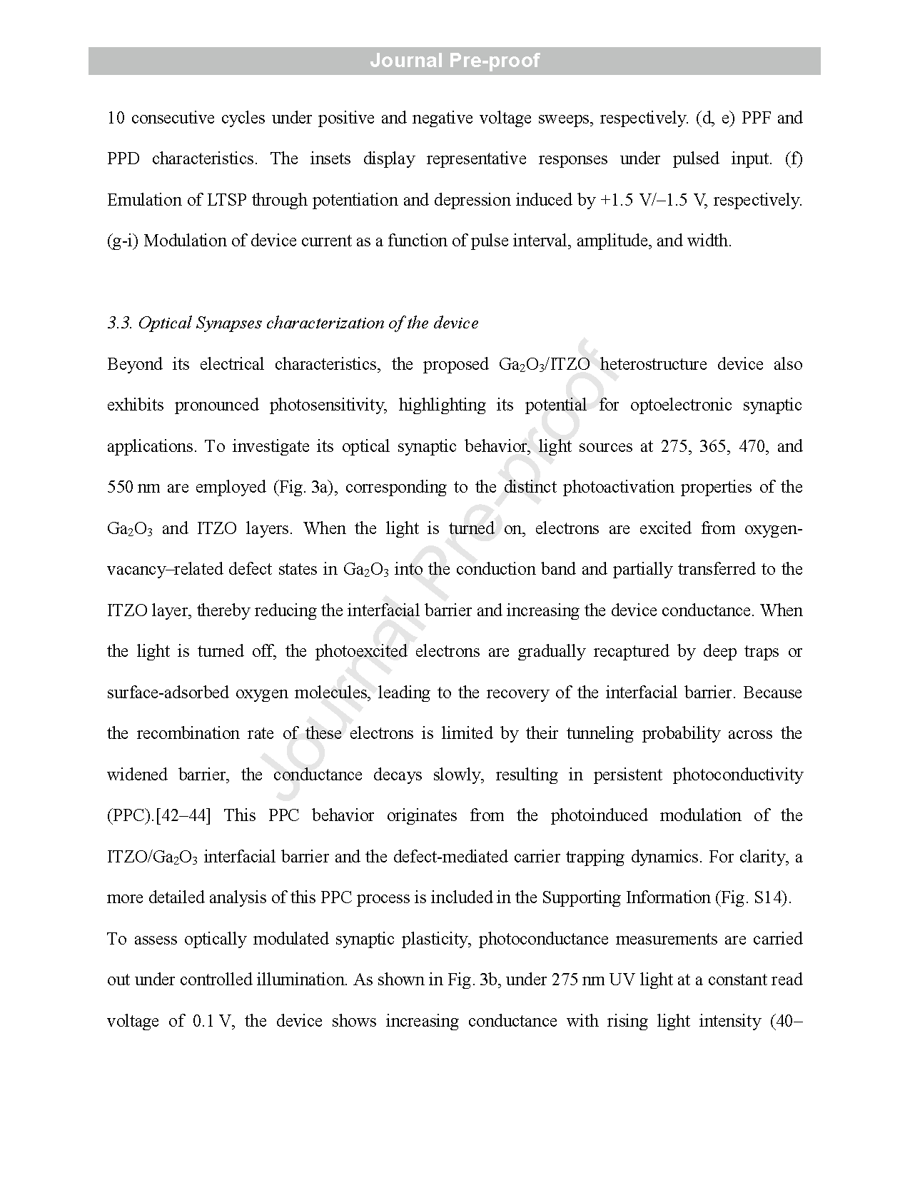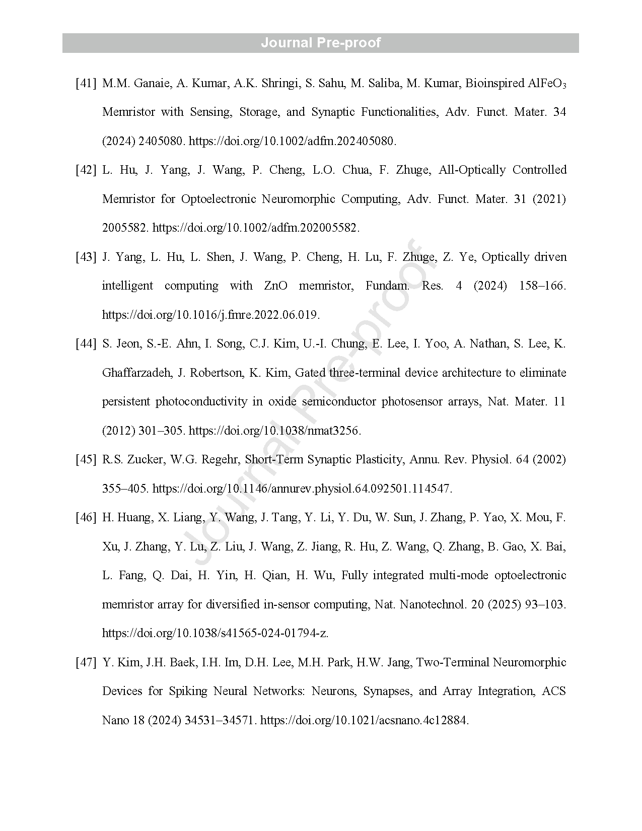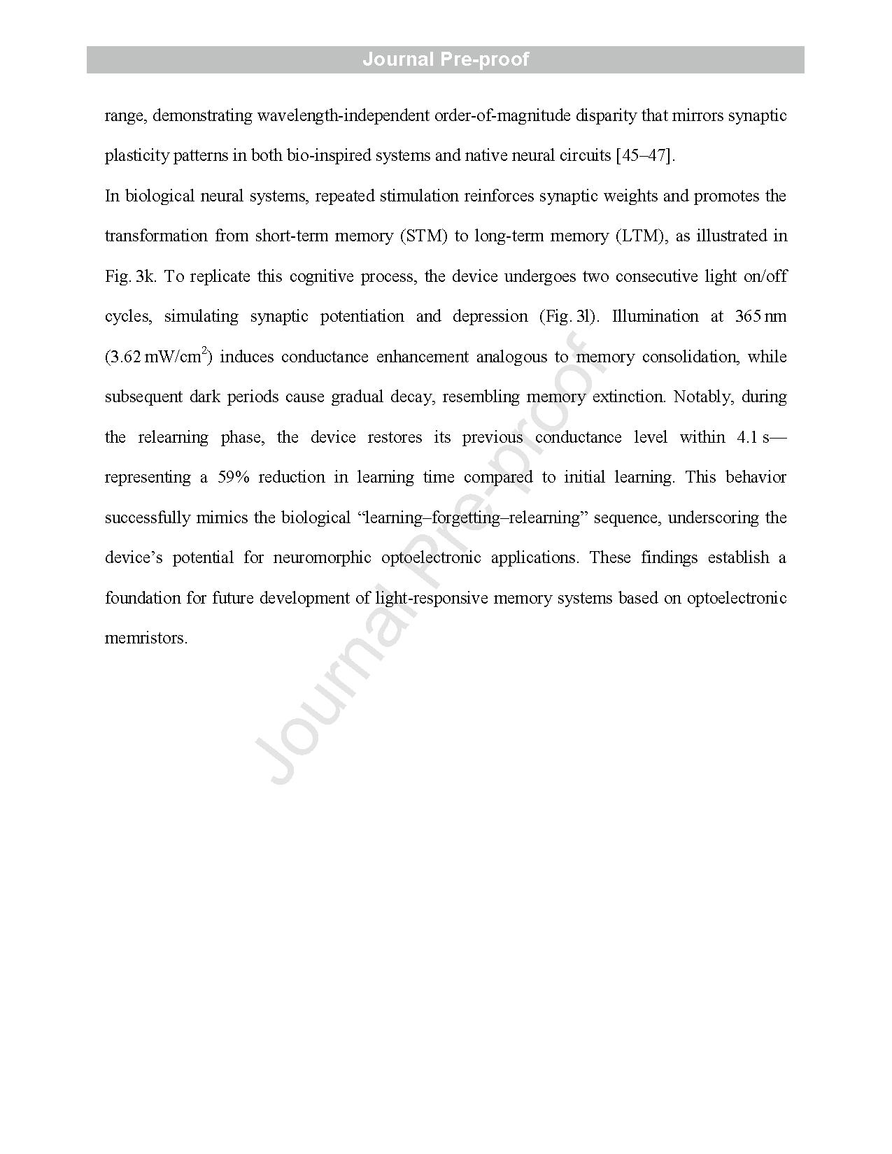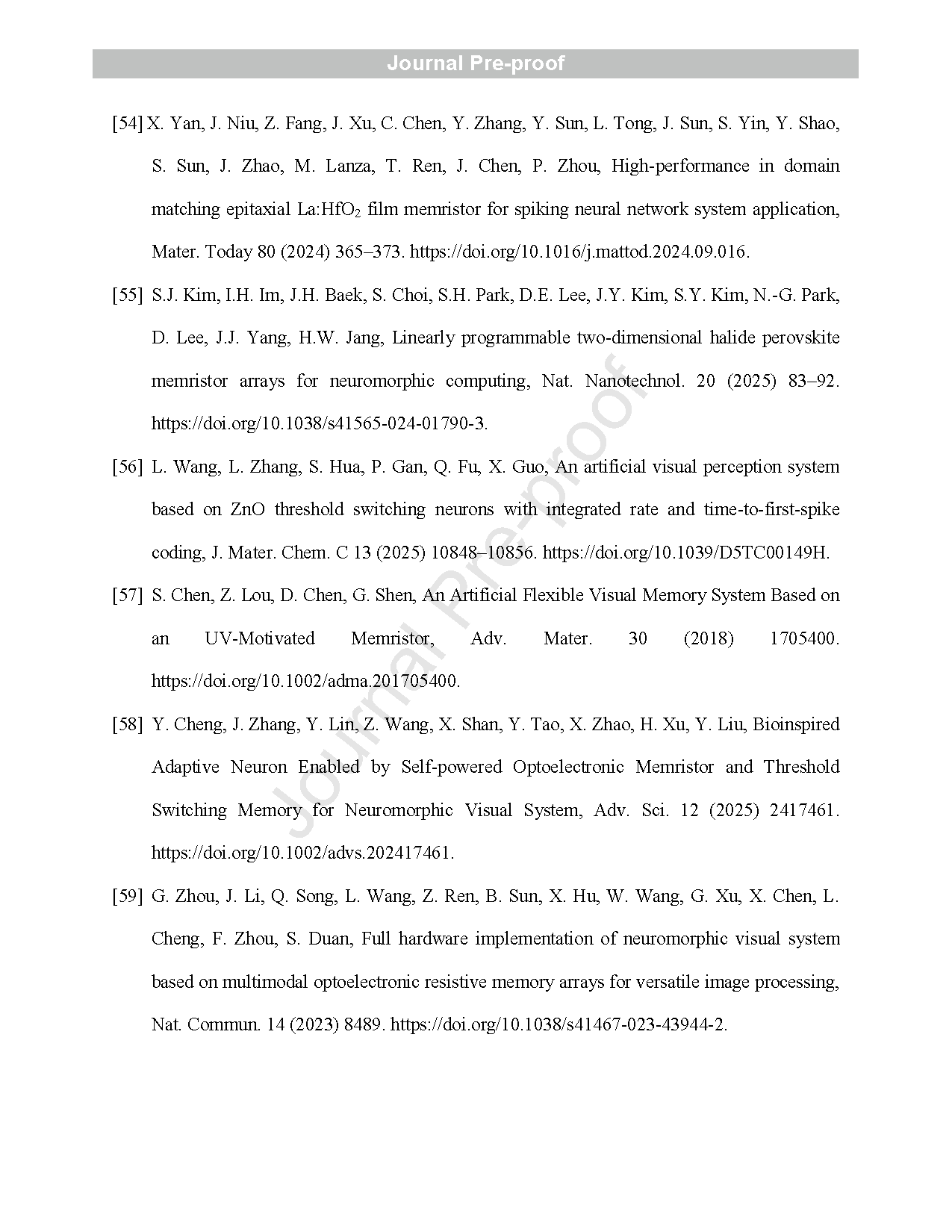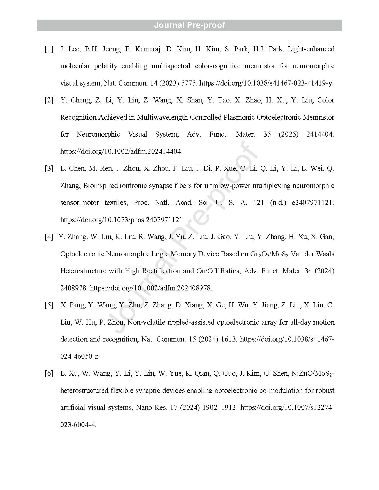 这些结果凸显了该器件在未来类脑视觉系统中的潜力。总体而言,在单一光电忆阻器平台上成功集成复杂关联学习、类脑计算以及感知–记忆耦合功能,为下一代智能电子器件的发展提供了重要支撑。该工作为实现高效、可适应、功能密集的类生物感知计算系统奠定了基础。尽管 ITZO/Ga2O3 光电忆阻器展现出优异的光响应与稳定的突触可塑性,但仍存在界面缺陷及光谱响应范围有限等问题。未来工作将着重于优化材料组成和界面工程,以提升均匀性、拓宽响应范围,并实现大规模集成,推动先进类脑视觉系统的发展。