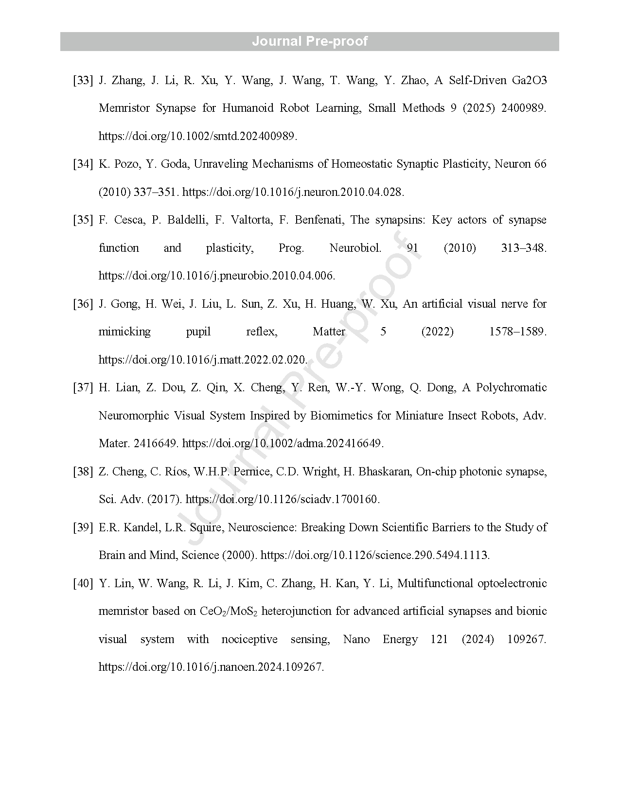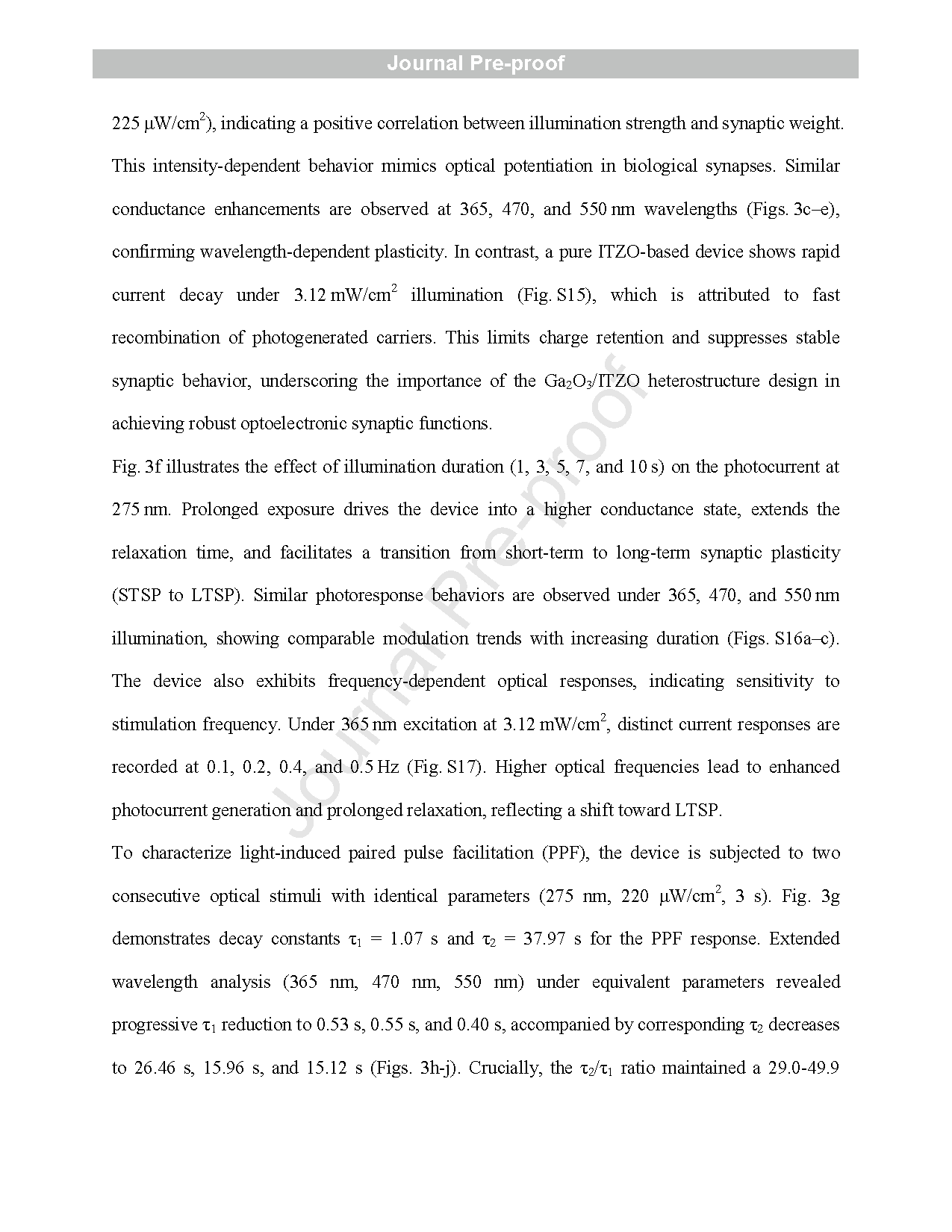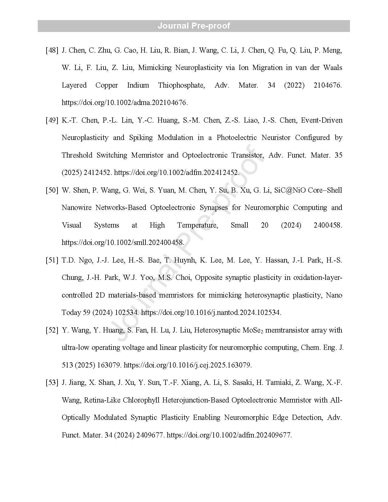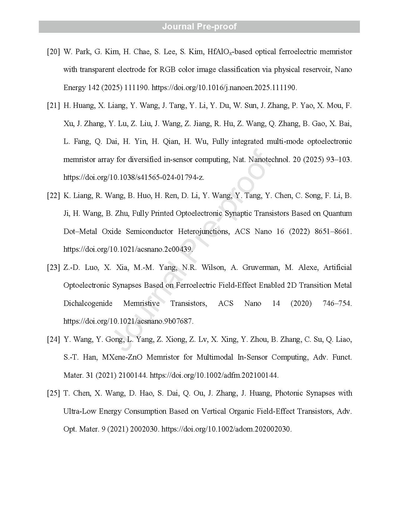 这些结果凸显了该器件在未来类脑视觉系统中的潜力。总体而言,在单一光电忆阻器平台上成功集成复杂关联学习、类脑计算以及感知–记忆耦合功能,为下一代智能电子器件的发展提供了重要支撑。该工作为实现高效、可适应、功能密集的类生物感知计算系统奠定了基础。尽管 ITZO/Ga2O3 光电忆阻器展现出优异的光响应与稳定的突触可塑性,但仍存在界面缺陷及光谱响应范围有限等问题。未来工作将着重于优化材料组成和界面工程,以提升均匀性、拓宽响应范围,并实现大规模集成,推动先进类脑视觉系统的发展。