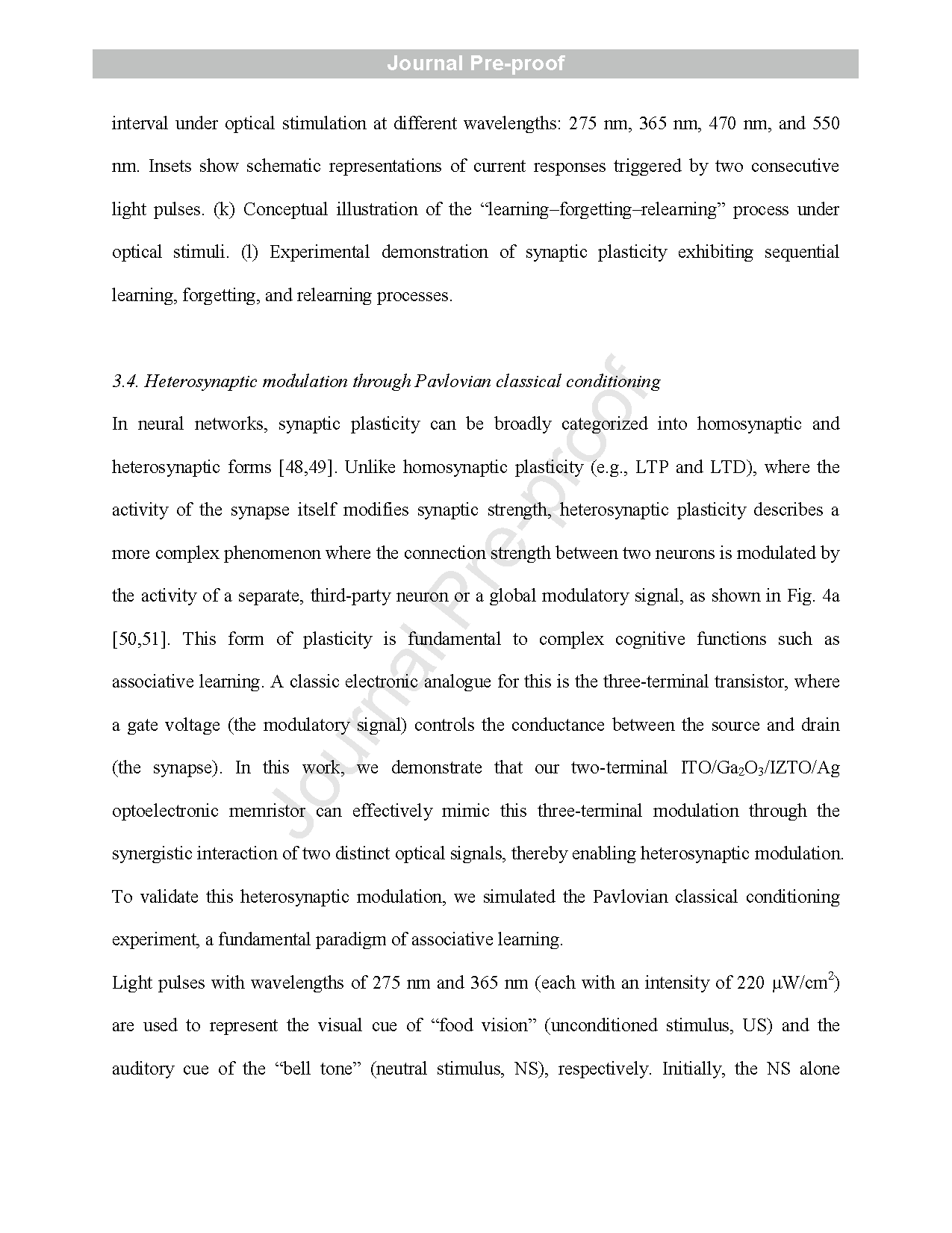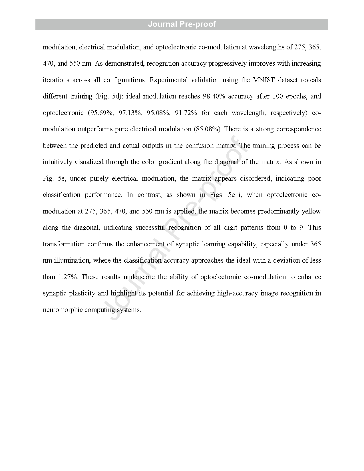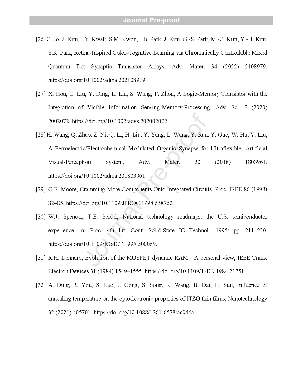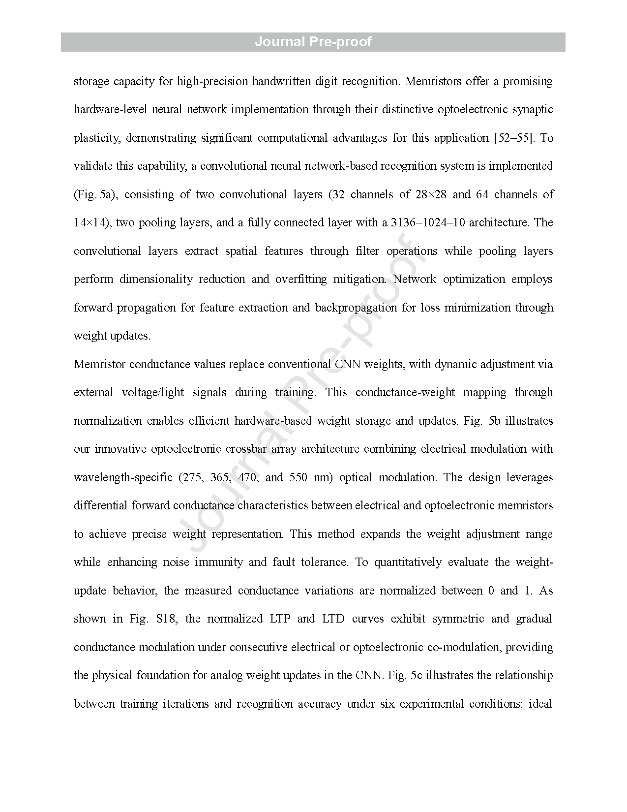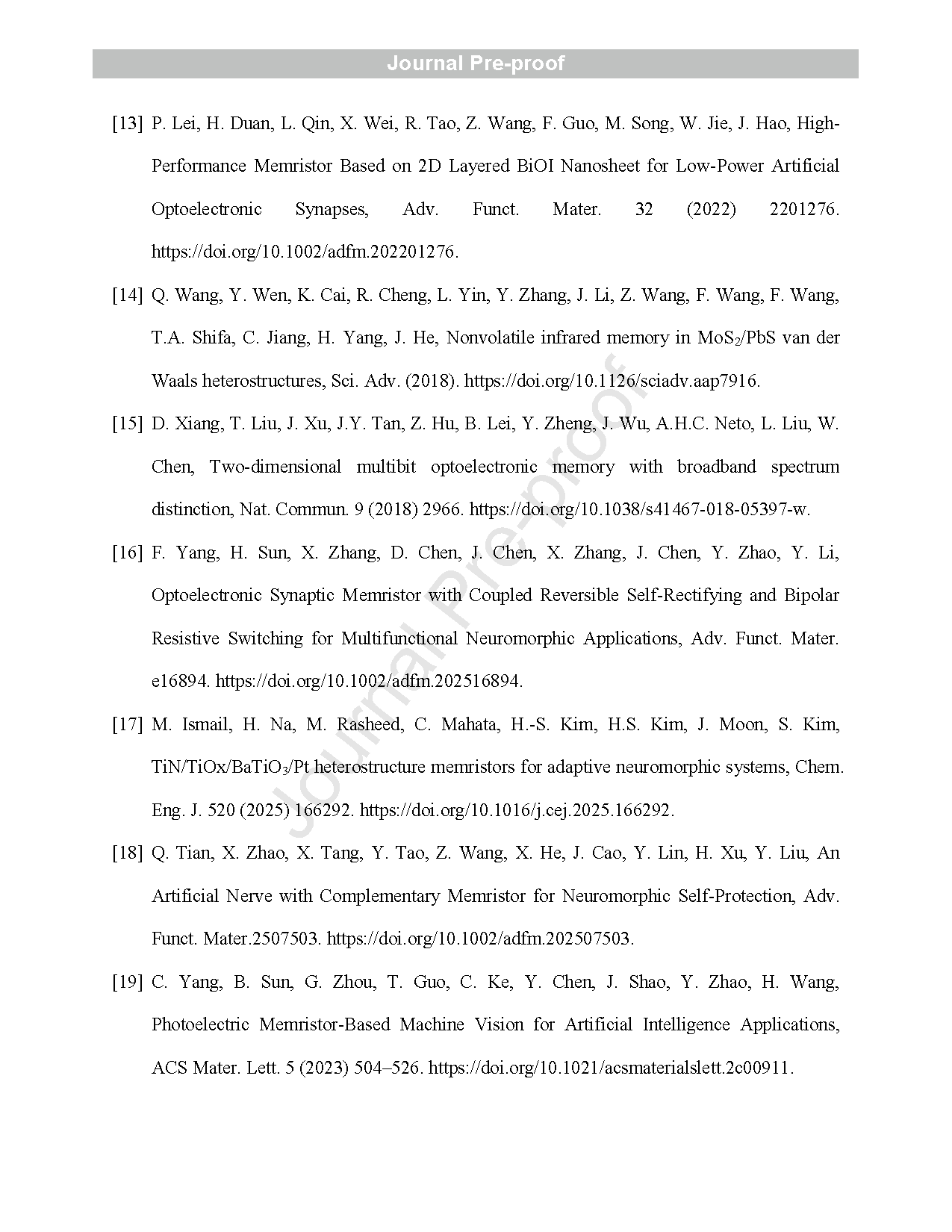这些结果凸显了该器件在未来类脑视觉系统中的潜力。总体而言,在单一光电忆阻器平台上成功集成复杂关联学习、类脑计算以及感知–记忆耦合功能,为下一代智能电子器件的发展提供了重要支撑。该工作为实现高效、可适应、功能密集的类生物感知计算系统奠定了基础。尽管 ITZO/Ga2O3 光电忆阻器展现出优异的光响应与稳定的突触可塑性,但仍存在界面缺陷及光谱响应范围有限等问题。未来工作将着重于优化材料组成和界面工程,以提升均匀性、拓宽响应范围,并实现大规模集成,推动先进类脑视觉系统的发展。