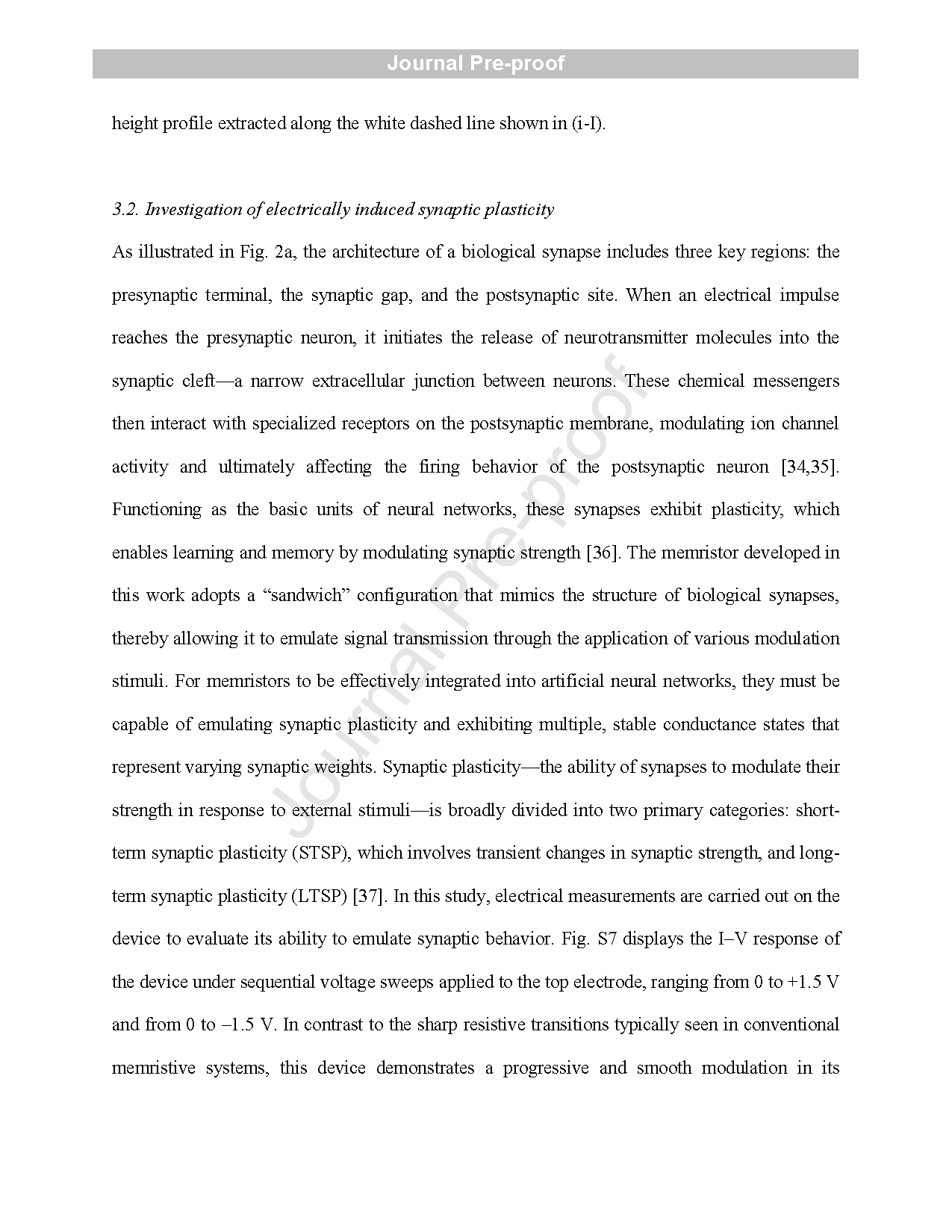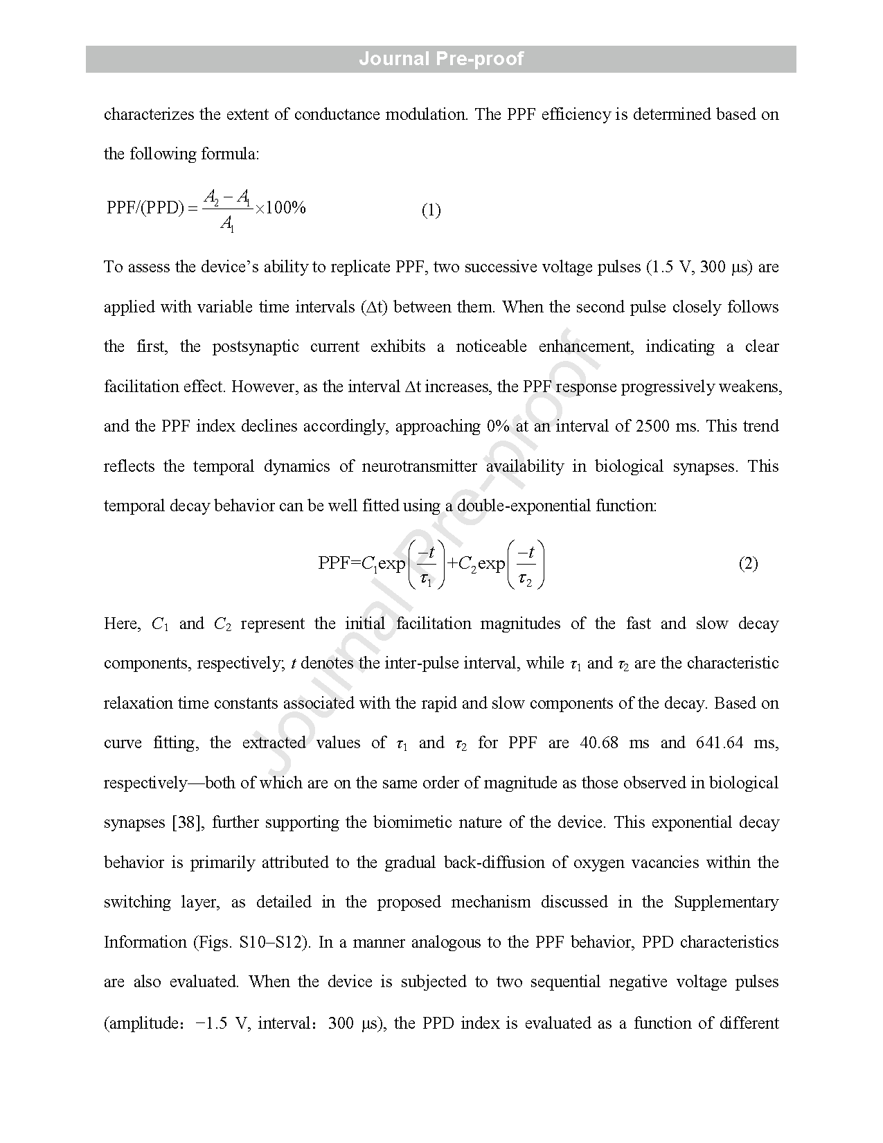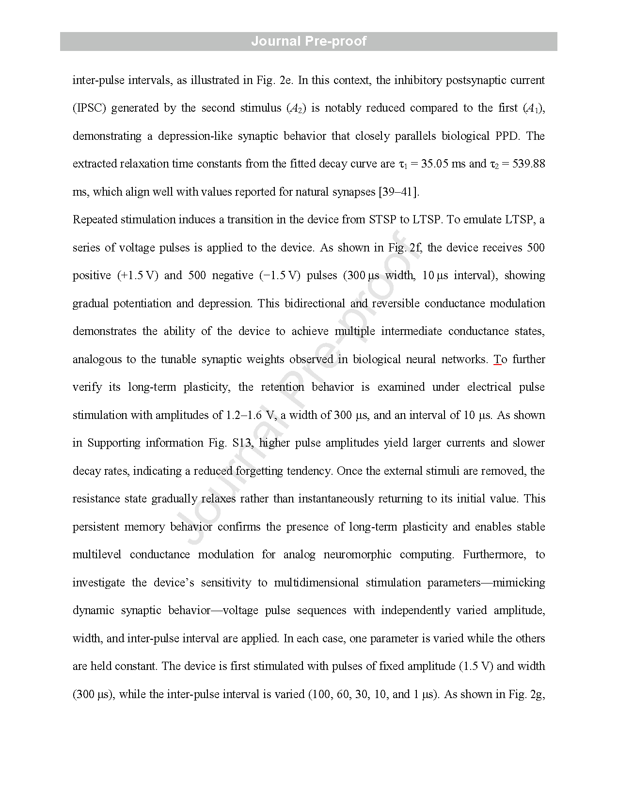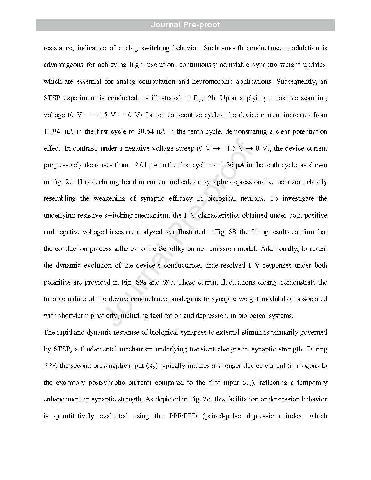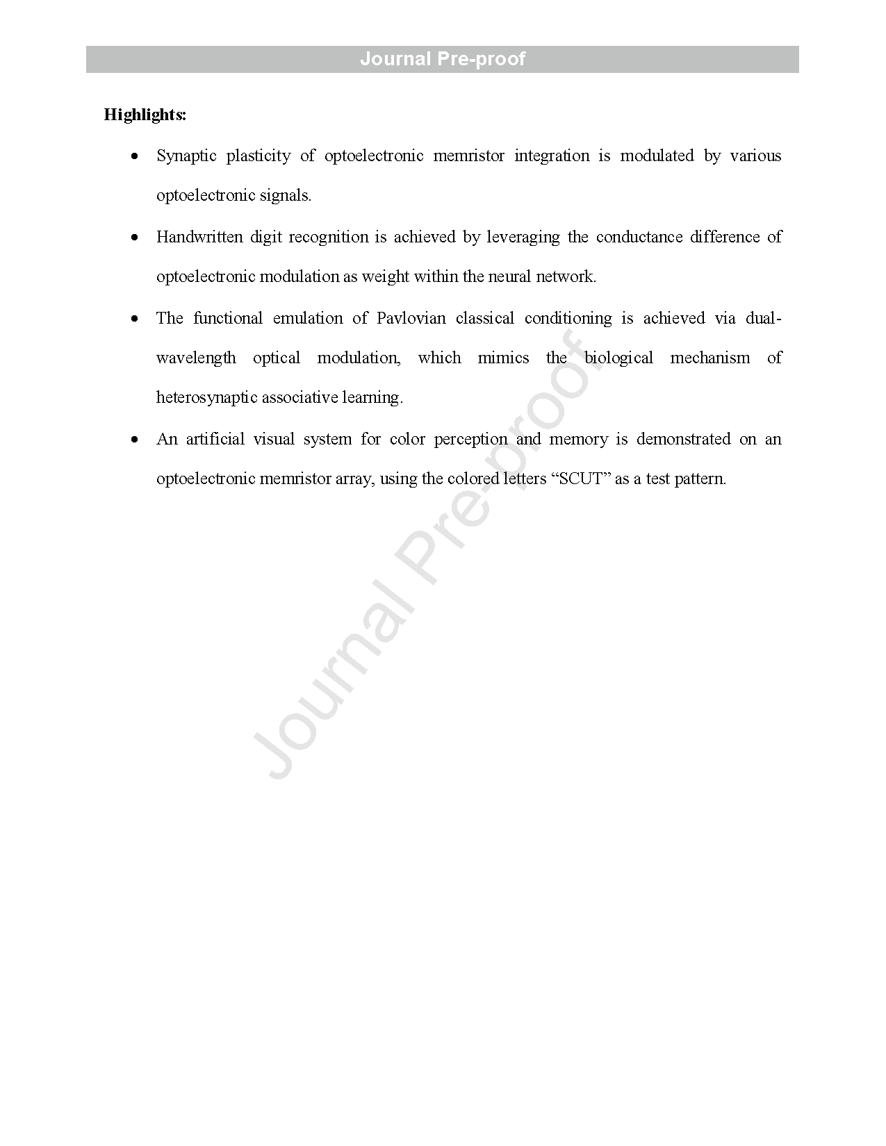 这些结果凸显了该器件在未来类脑视觉系统中的潜力。总体而言,在单一光电忆阻器平台上成功集成复杂关联学习、类脑计算以及感知–记忆耦合功能,为下一代智能电子器件的发展提供了重要支撑。该工作为实现高效、可适应、功能密集的类生物感知计算系统奠定了基础。尽管 ITZO/Ga2O3 光电忆阻器展现出优异的光响应与稳定的突触可塑性,但仍存在界面缺陷及光谱响应范围有限等问题。未来工作将着重于优化材料组成和界面工程,以提升均匀性、拓宽响应范围,并实现大规模集成,推动先进类脑视觉系统的发展。