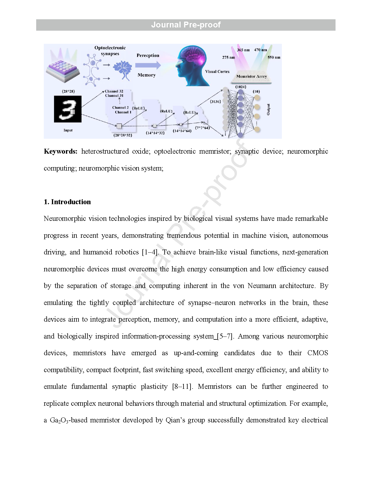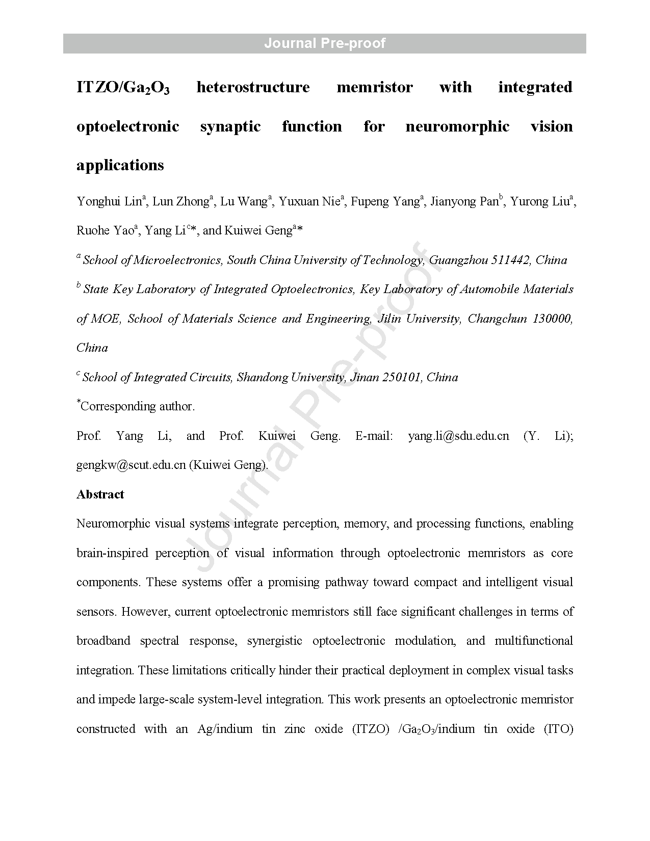 由华南理工大学的研究团队在学术期刊 Chemical Engineering Journal 发布了一篇名为 ITZO/Ga2O3 heterostructure memristor with integrated optoelectronic synaptic function for neuromorphic vision applications(具有集成光电突触功能的 ITZO/Ga2O3 异质结忆阻器在类脑视觉应用中的研究)的文章。