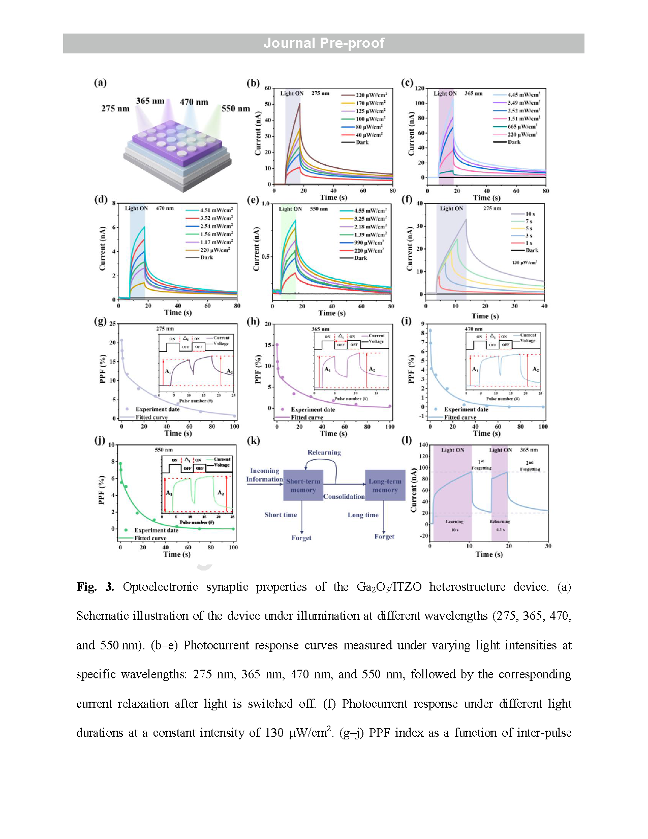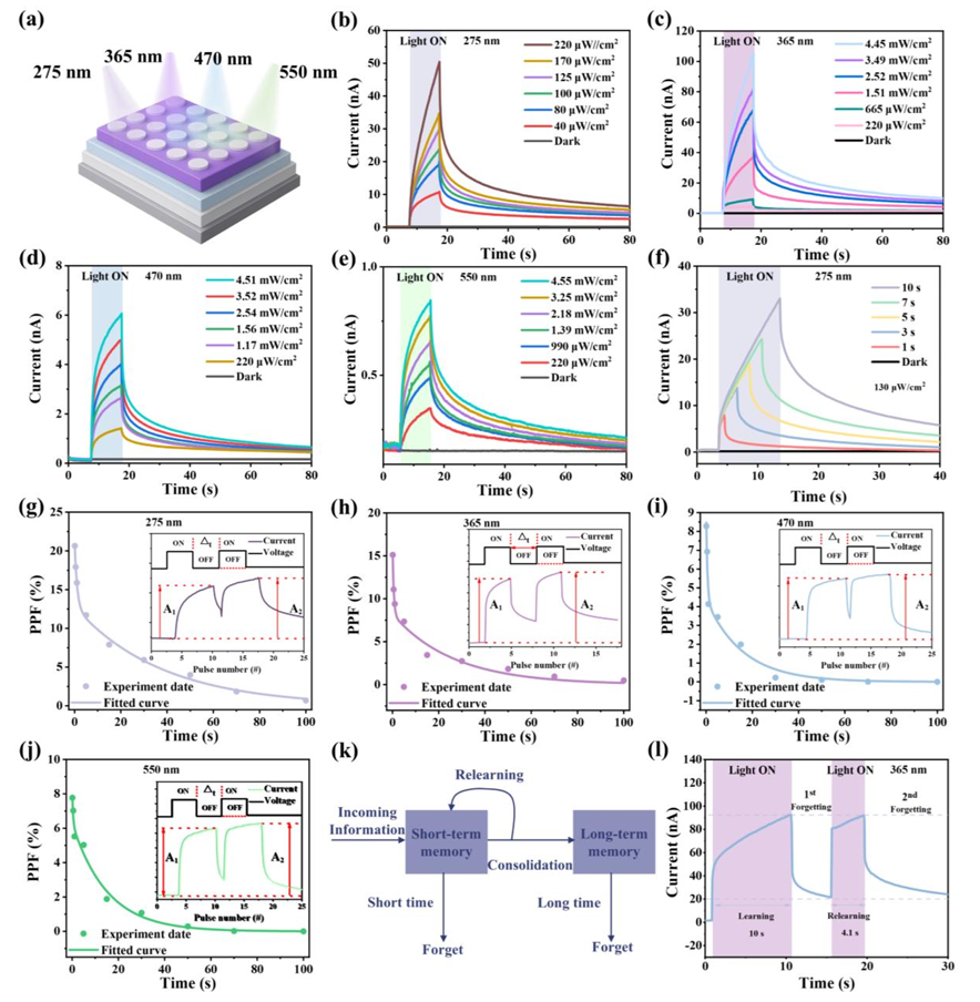 图 3. Ga₂O₃/ITZO 异质结器件的光电突触特性。(a) 器件在不同波长光照(275、365、470 和 550 nm)下的示意图。(b–e) 在特定波长下、不同光强条件下测得的光电流响应曲线及光关闭后的电流衰减。(f) 在恒定光强 130 μW/cm² 下,不同照射时间的光电流响应。(g–j) 光刺激下 PPF 指数随脉冲间隔变化的关系:275 nm、365 nm、470 nm 和 550 nm。插图显示两次连续光脉冲触发的电流响应示意。(k) 光刺激下“学习–遗忘–再学习”过程的概念性示意图。(l) 实验展示了突触可塑性,表现出连续的学习、遗忘与再学习过程。