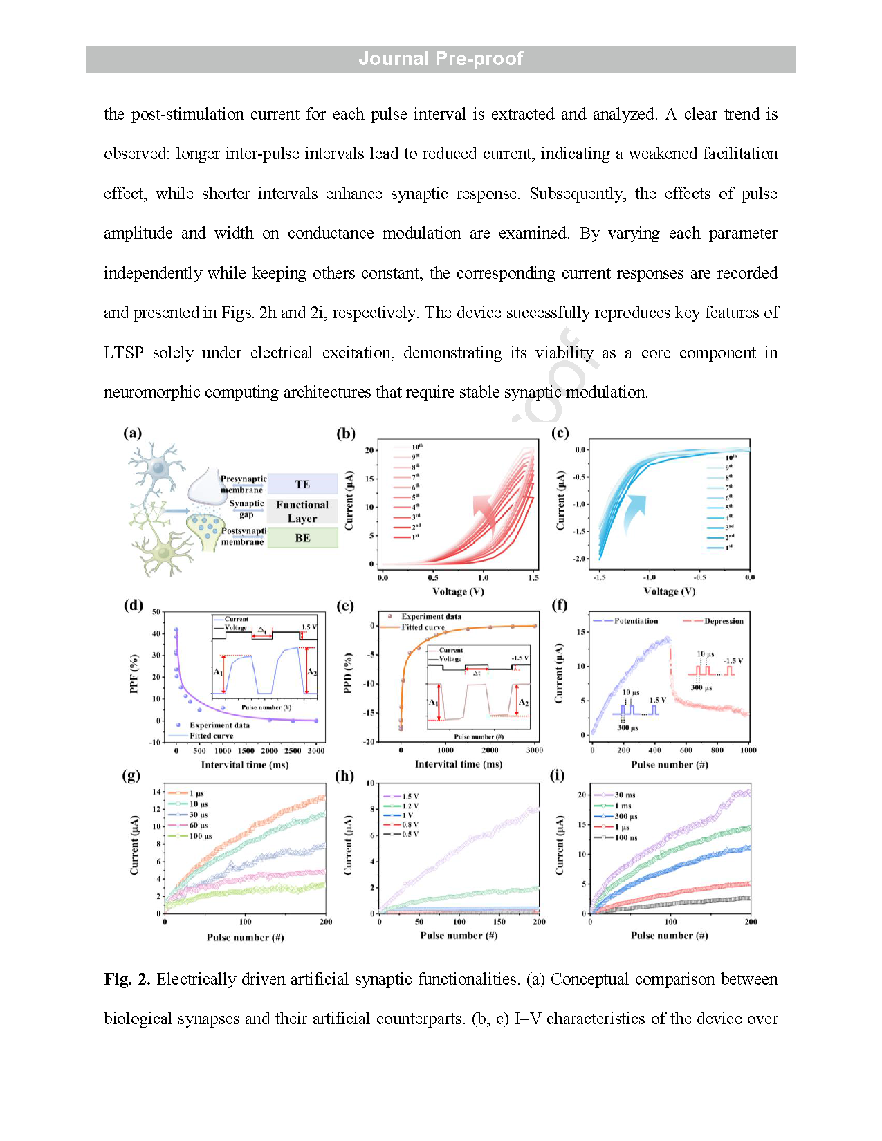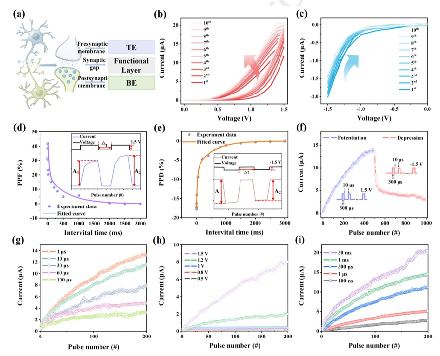 图 2. 电驱动人工突触功能。(a) 生物突触与人工突触的概念性比较。(b, c) 器件在正负电压扫描下连续 10 个周期的 I–V 特性。(d, e) PPF 与 PPD 特性。插图显示脉冲输入下的典型响应。(f) 通过 +1.5 V / –1.5 V 诱导的增强与抑制来模拟 LTSP。(g–i) 器件电流随脉冲间隔、幅度和宽度的调制关系。
