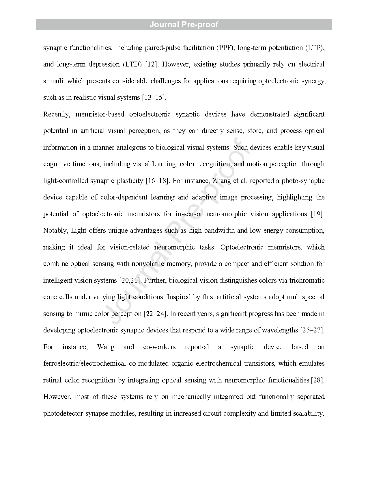 近年来,受生物视觉系统启发的类脑视觉技术取得了显著进展,旨在将感知、记忆和计算功能集成到紧凑且高能效的器件中。忆阻器因其能够模拟突触可塑性、兼容CMOS工艺、切换速度快而成为有前景的候选器件,但传统电刺激器件在涉及光电协同的视觉任务中存在局限。光电忆阻器通过将光感知与存储和计算结合,为人工视觉系统提供了实现颜色识别、学习和运动感知的途径。尽管在多波段感应和突触器件设计方面已有进展,但在器件性能、功能集成和可扩展性方面仍面临挑战。这促使研究者开发能够同时实现突触调控、多色感知和类脑计算的单器件光电忆阻器,为构建仿生一体化视觉系统奠定了基础。