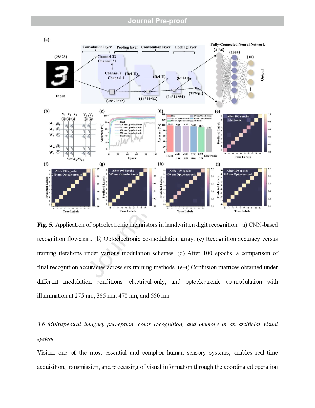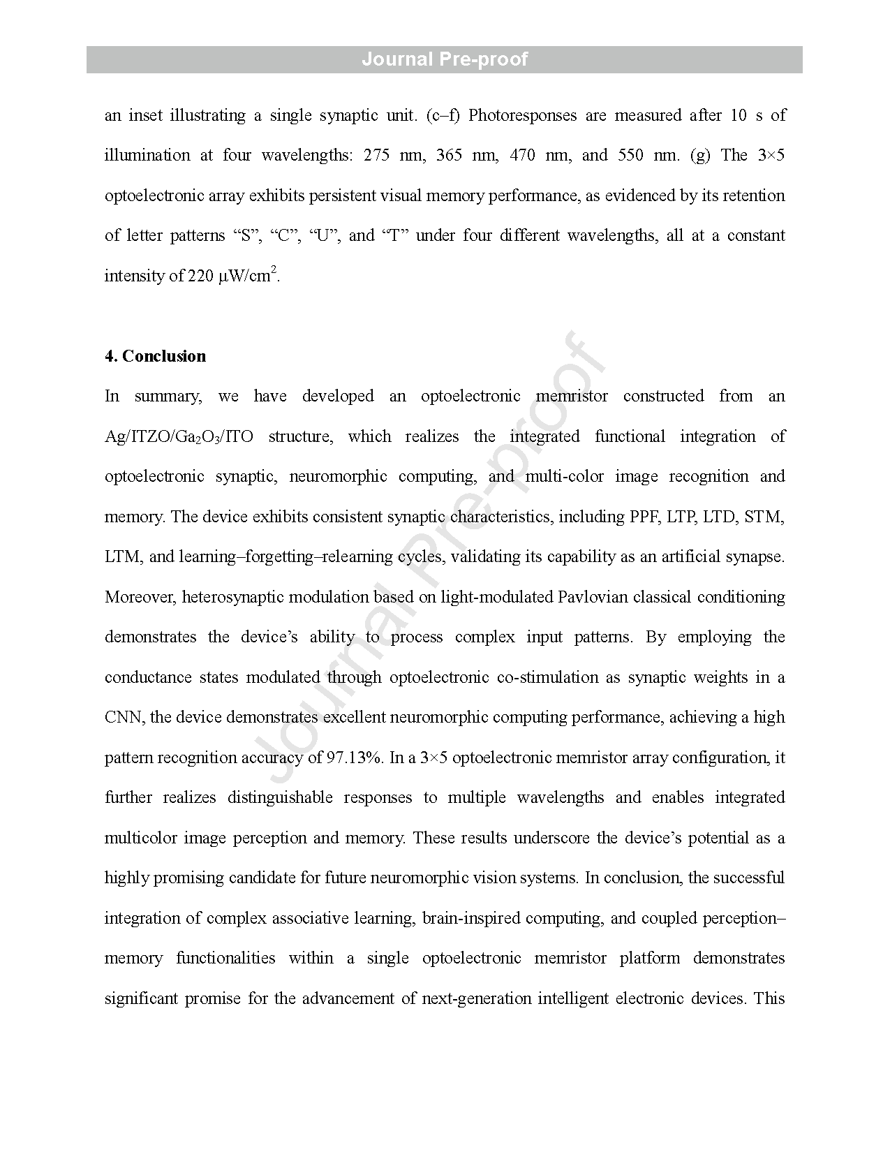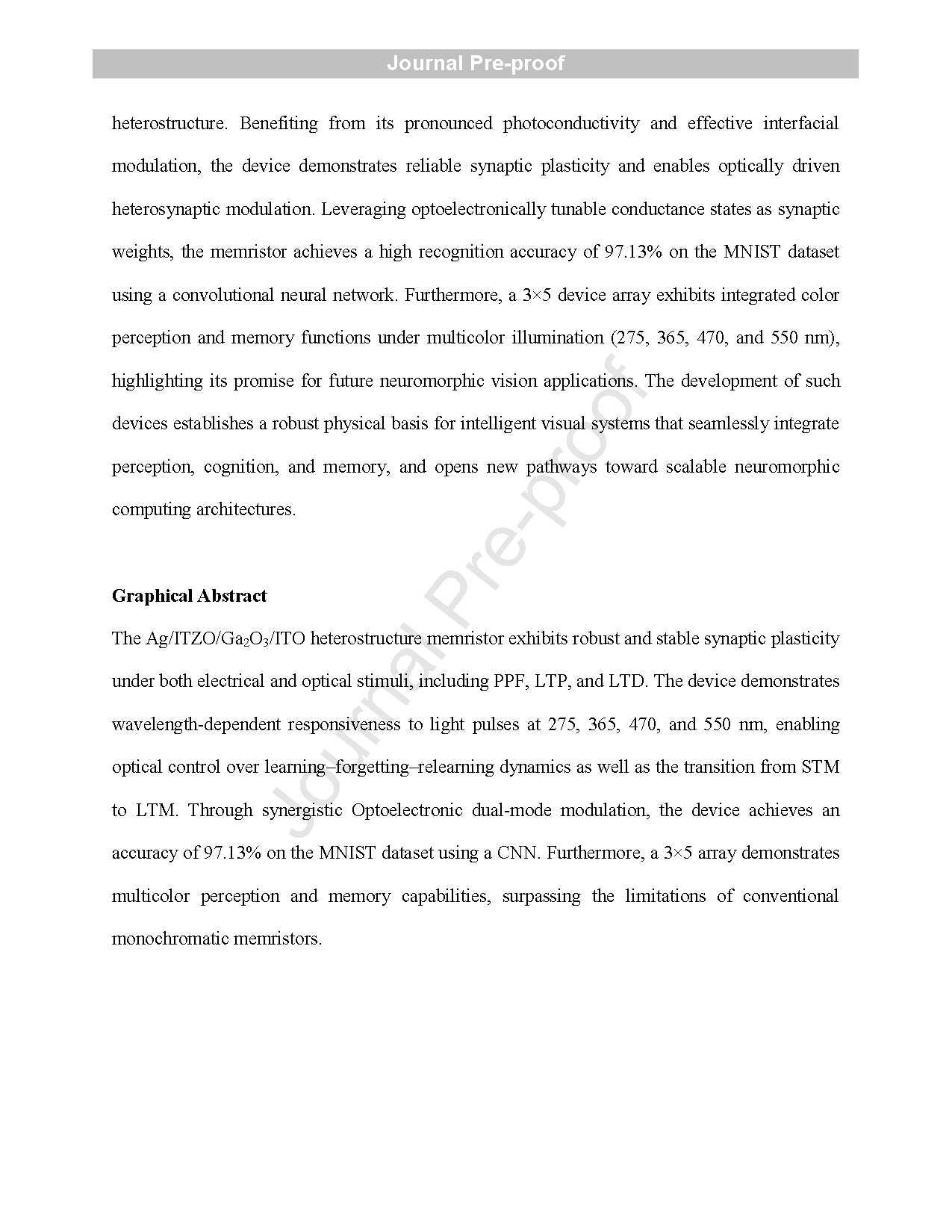 本研究开发了一种基于 Ag/ITZO/Ga2O3/ITO 结构的光电忆阻器,实现了光电突触、类脑计算以及多色图像识别与记忆的功能集成。该器件表现出稳定的突触特性,包括 PPF、LTP、LTD、STM、LTM 以及学习–遗忘–再学习循环,验证了其作为人工突触的可行性。此外,通过基于光调控的巴甫洛夫经典条件反射实现的异突触调制,展示了器件处理复杂输入模式的能力。将光电共调制下的导通状态作为卷积神经网络(CNN)的突触权重,器件表现出优异的类脑计算性能,实现了高达 97.13% 的图像识别准确率。在 3×5 光电忆阻器阵列中,器件对多波长光照呈现可区分响应,并实现多色图像的集成感知与记忆。