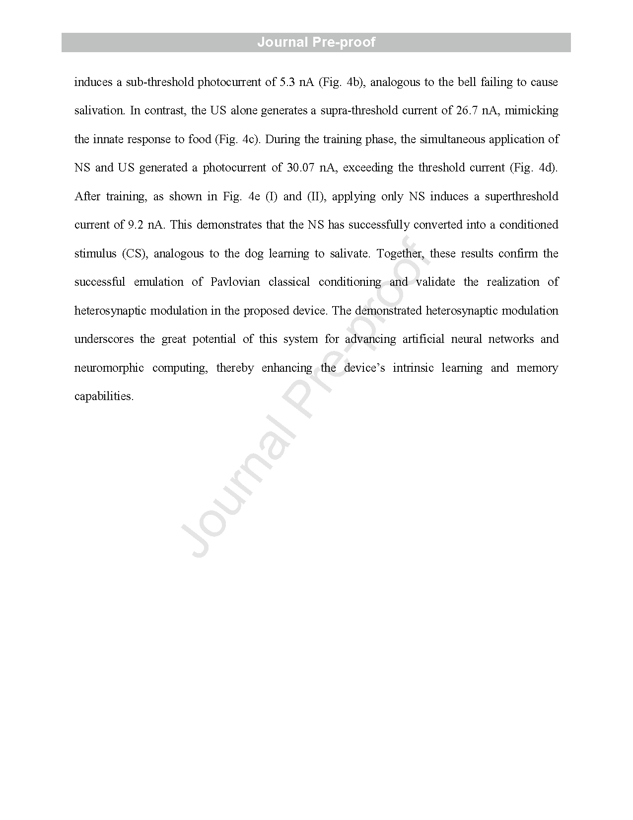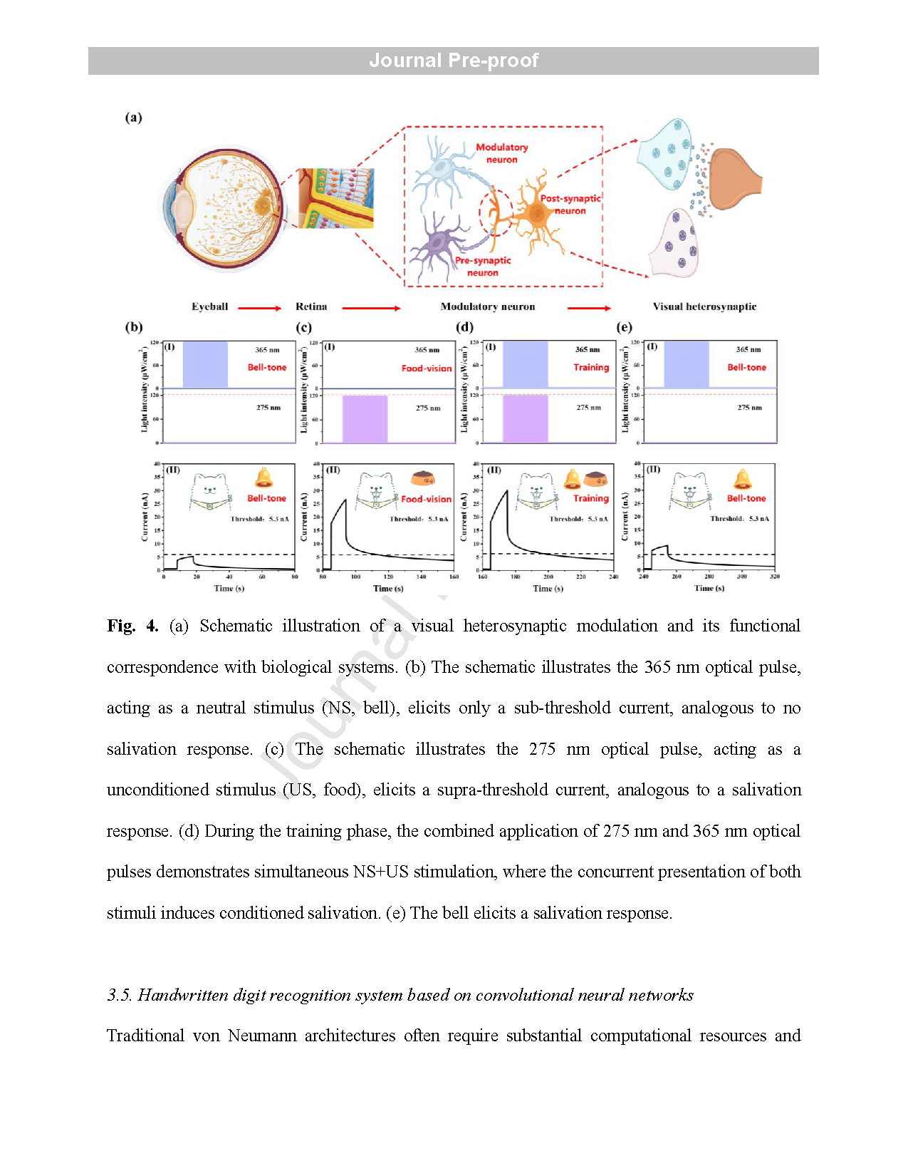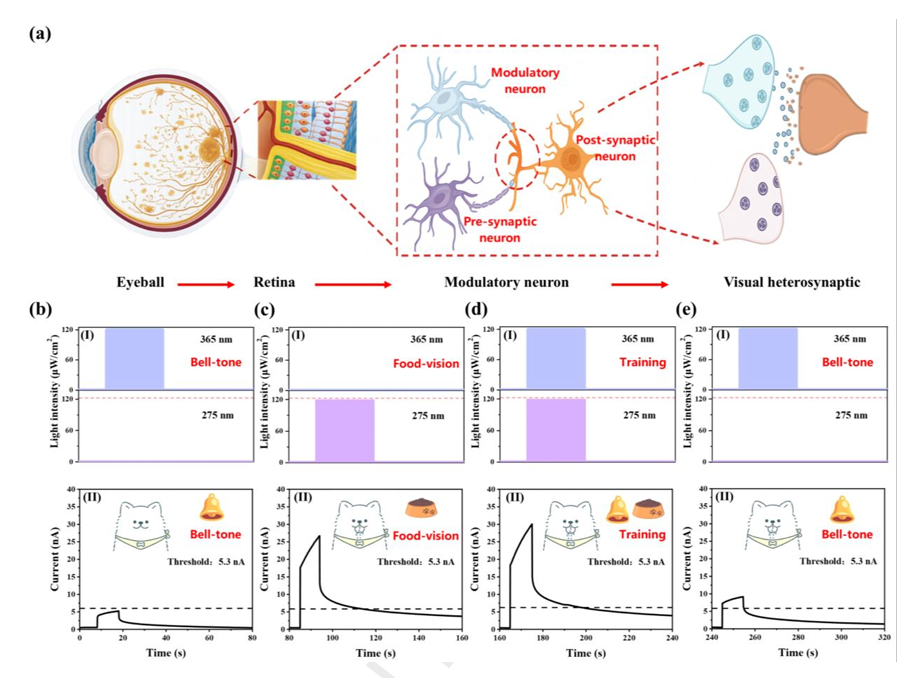 图 4. 视觉异突触调制。(a) 视觉异突触调制及其与生物系统功能对应关系的示意图。(b) 365 nm 光脉冲作为中性刺激(NS,铃声),仅引发亚阈值电流,类似于无唾液反应。(c) 275 nm 光脉冲作为无条件刺激(US,食物),引发超阈值电流,类似于唾液分泌反应。(d) 训练阶段,275 nm 与 365 nm 光脉冲的联合应用表现为 NS+US 同时刺激,协同作用产生条件化唾液反应。(e) 铃声引发唾液反应。