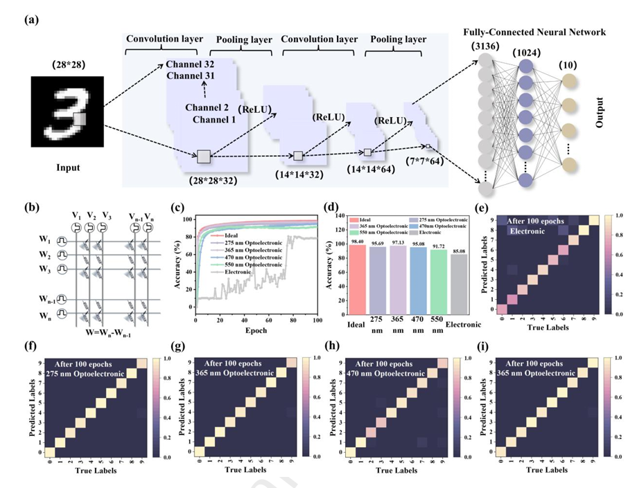 图 5. 光电忆阻器在手写数字识别中的应用。(a) 基于 CNN 的识别流程图。(b) 光电协同调制阵列示意。(c) 不同调制方案下识别准确率随训练迭代次数变化。(d) 100 个训练周期后,六种训练方法的最终识别准确率比较。(e–i) 在不同调制条件下获得的混淆矩阵:仅电调制,以及光电协同调制下 275 nm、365 nm、470 nm 和 550 nm 光照条件。