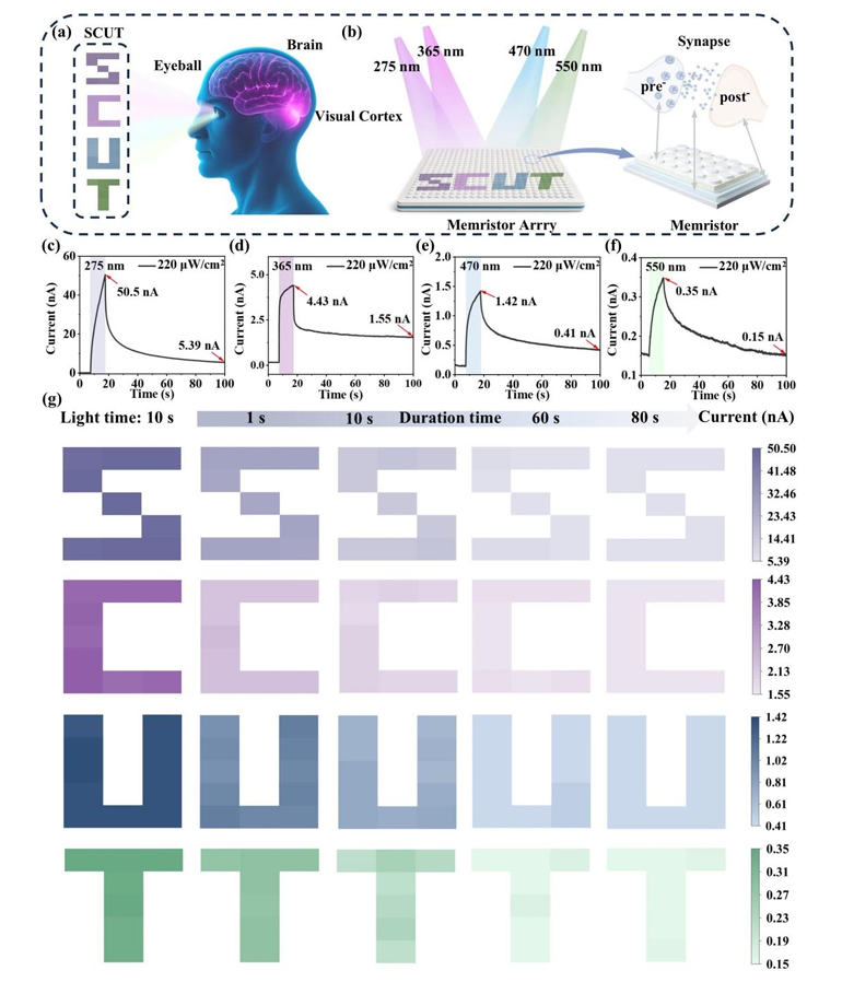 图 6. 人工视觉感知与记忆功能。(a) 人工视觉系统的示意图。(b) 光电忆阻器阵列的结构示意图,插图显示单个突触单元。(c–f) 四个波长(275 nm、365 nm、470 nm 和 550 nm)照射 10 秒后的光响应。(g) 3×5 光电阵列展示了持续的视觉记忆性能,可在四种波长下保持字母“S”、“C”、“U”、“T”图案,光强恒定为 220 μW/cm²。