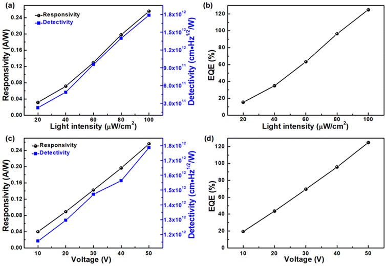 图 7 (a)掺铝 γ-Ga2O3 薄膜基 MSM 结构光电探测器的响应度和探测率随偏置电压的变化情况。(b)该器件的外量子效率随偏置电压的变化情况。(c)该器件的响应度和探测率随光强的变化情况。(d)该器件的外量子效率随光强的变化情况。